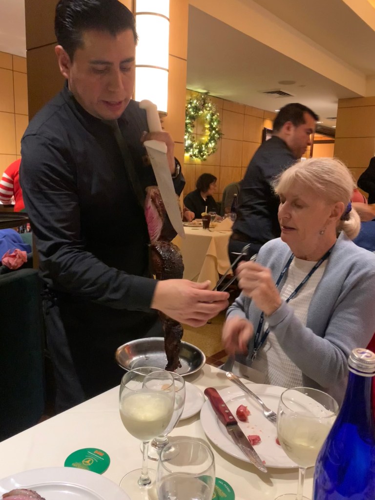 Dinner at Churrascaria Plataforma – a Brazilian restaurant where you start with various salads and sides from a buffet. Then come “the meats” threaded onto skewers and sliced off. Here the server is handing Kathy her tongs to grab the slice as the server finishes. There were about 6 different meats: sausages, chicken, and several cuts of beef.