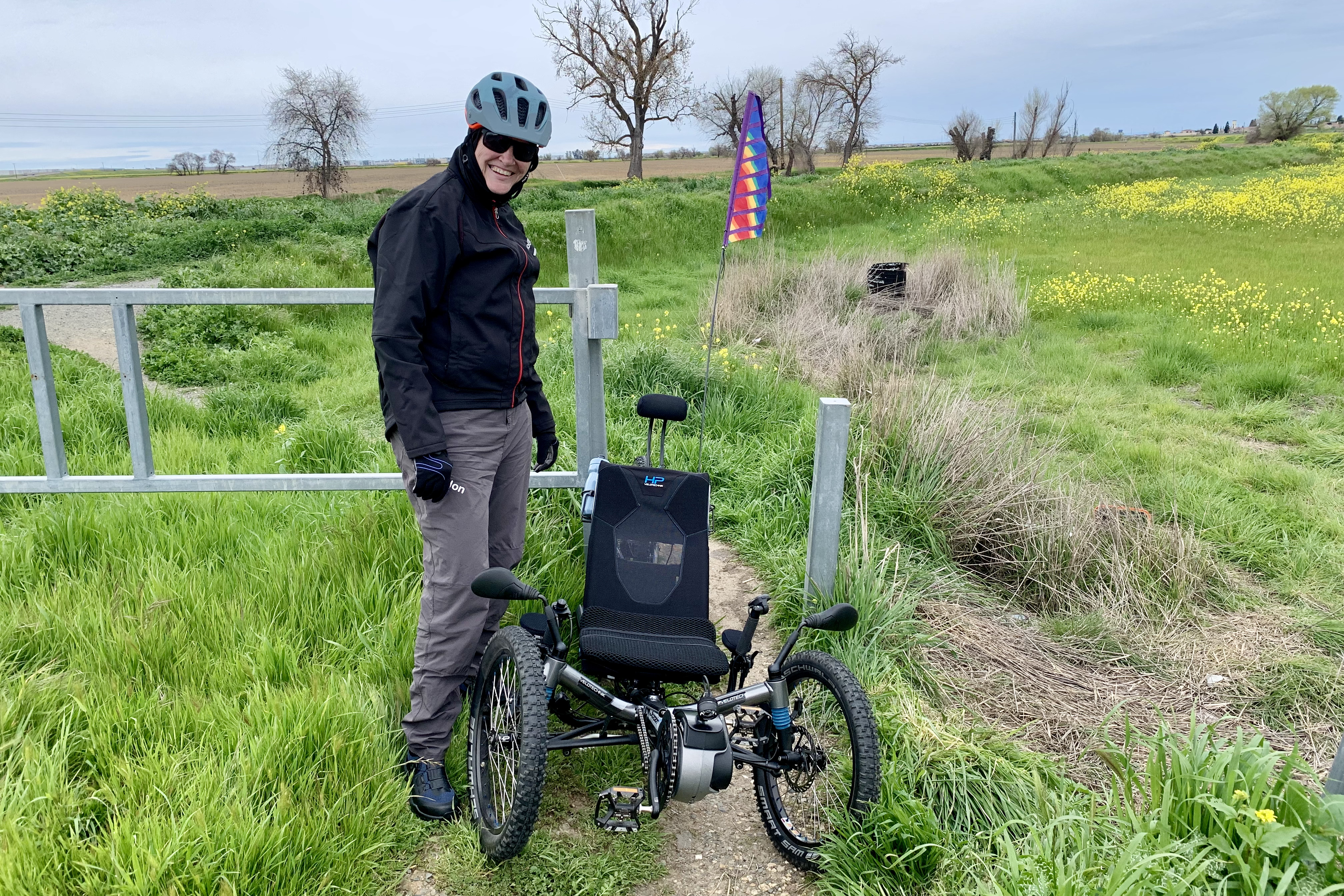 Dani and I went for a ride today. So much fun. Near the end of the 30-mile ride, Dani chose a short non-paved trail. I followed, I have wide tires. Then I told her about a non-paved trail along a canal that she might enjoy and off we went. Except at the exit at Del Paso Rd, there was a gate with a narrow opening. My bike was easy. Dani’s trike was another story. We ended up turning the trike on its side and lifting it through, angling to allow for the mirrors first, then the headrest. Whew! We did it.