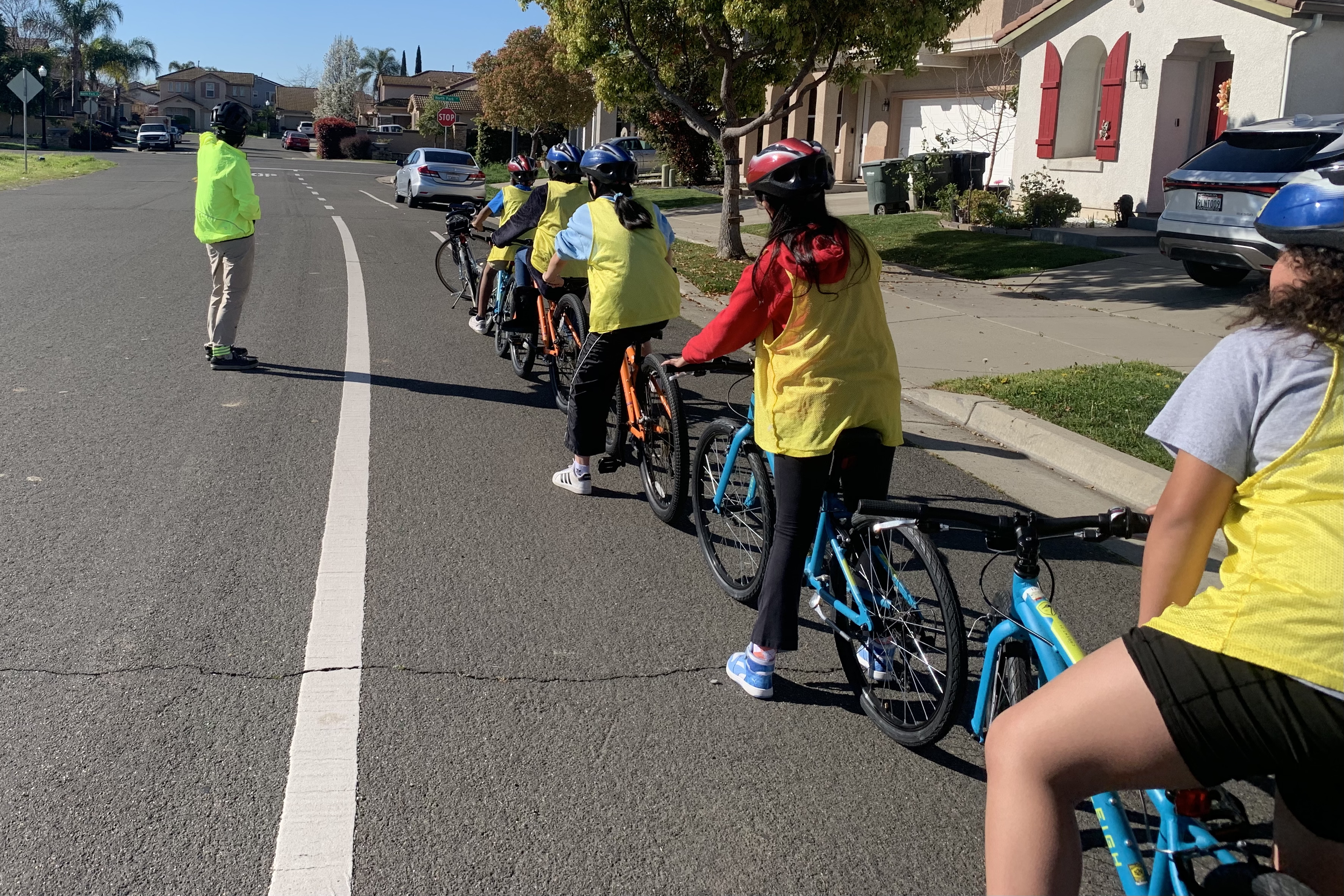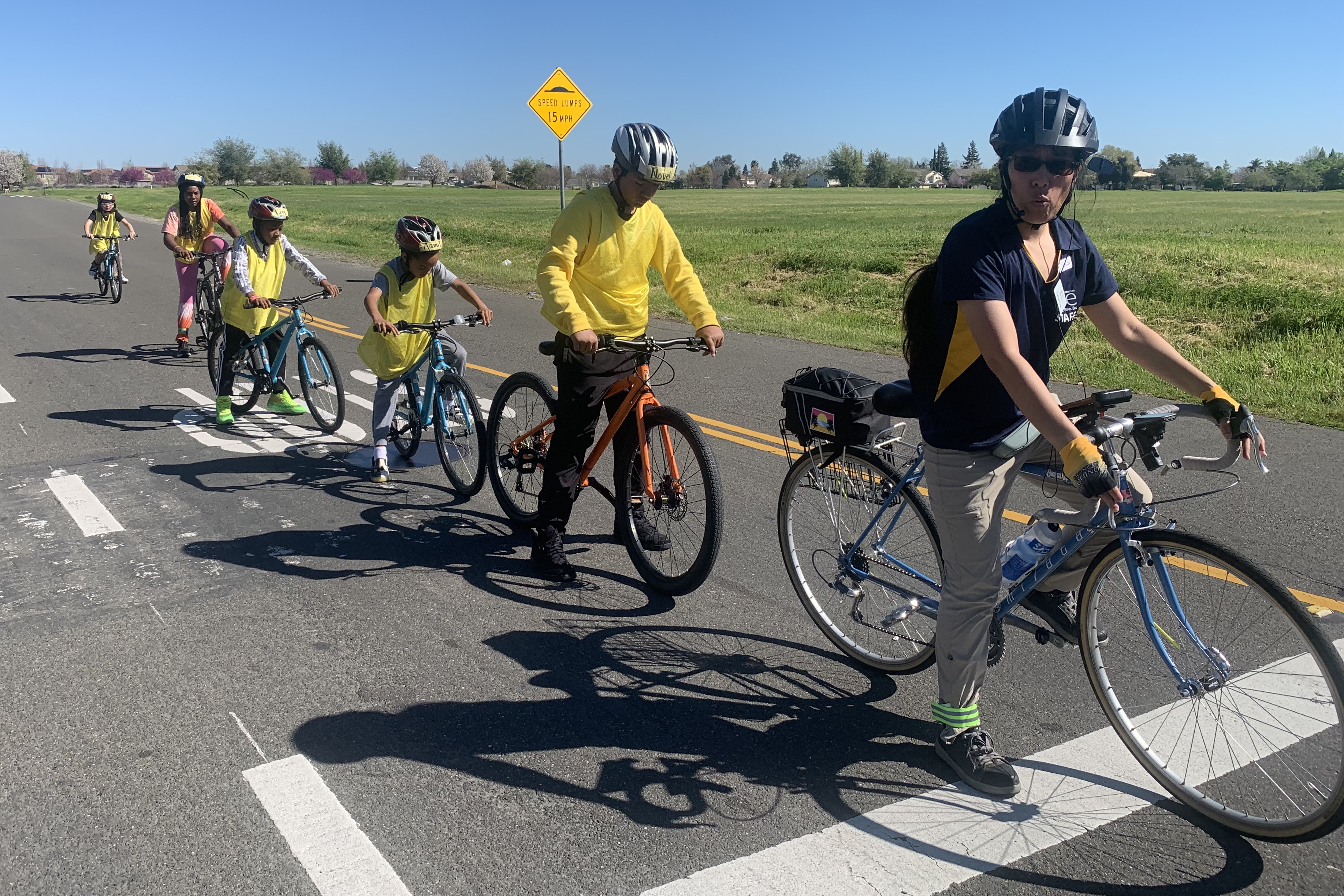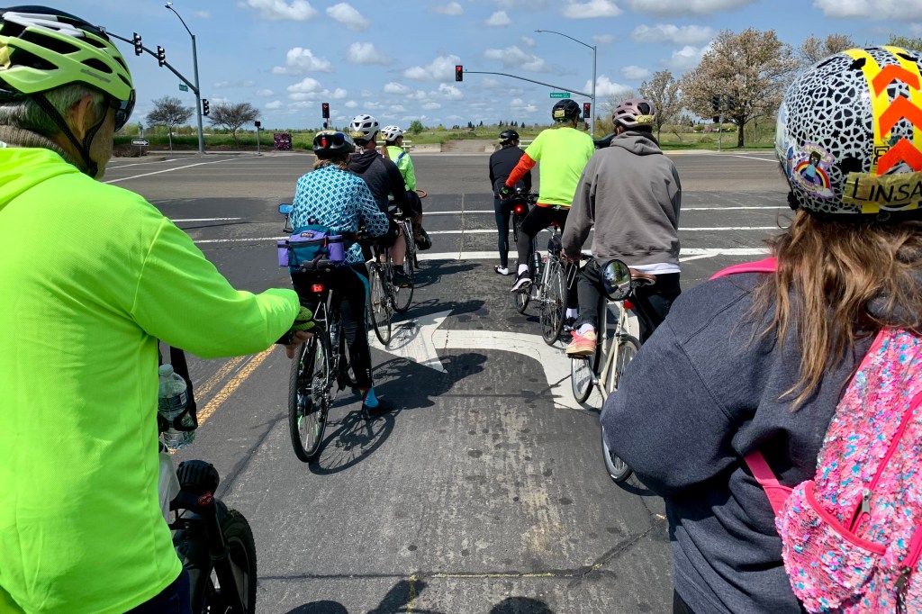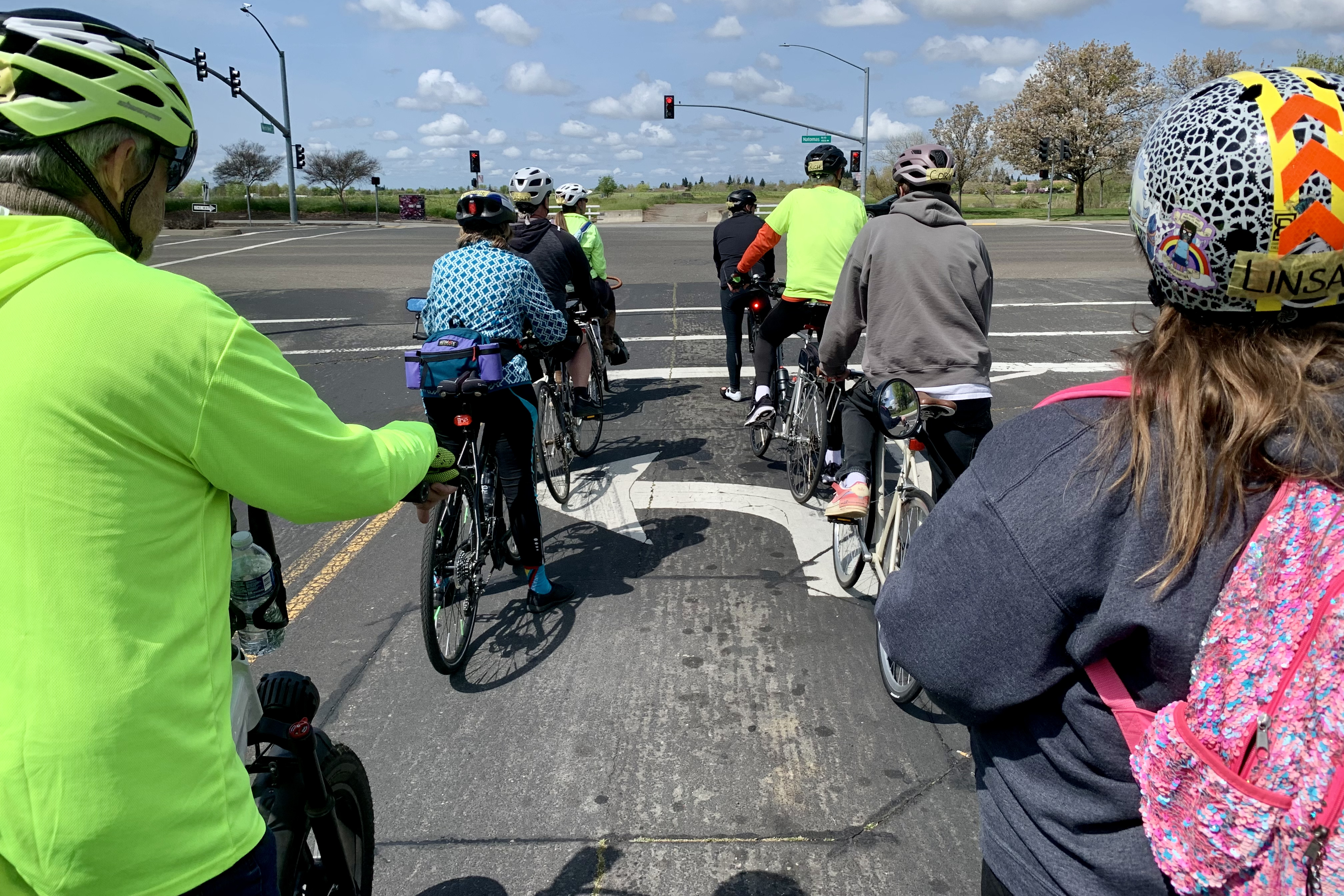Gina and I worked with another group which included everyone who wants to move on to the LCI seminar. We rode a route in the neighborhood which included a few teaching stops. I rode sweep for the first part. Here, a left turn onto Natomas Blvd .. a great example of doubling up at an intersection with (almost) everyone in power pedal position waiting for the light to turn green.