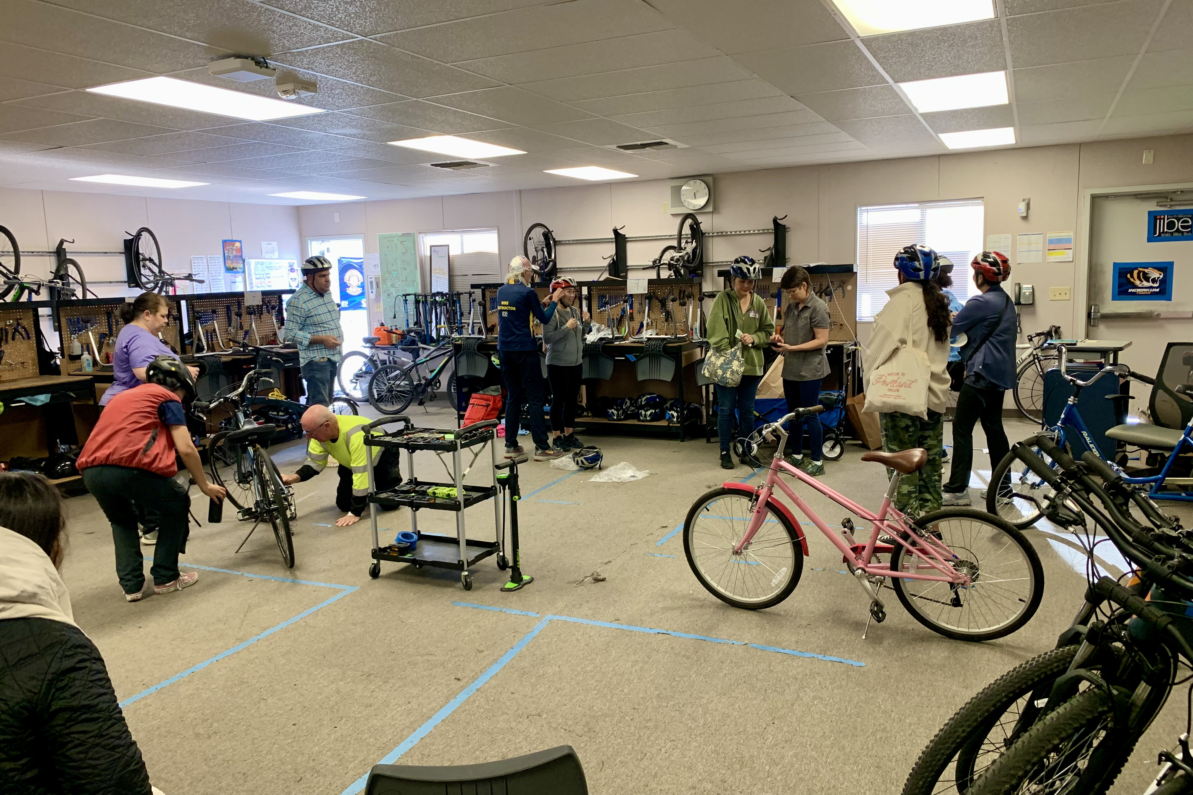Wednesday evening. We had 15 people signed up with 3 LCIs and 2 volunteers. We worked out of the Bike Tech classroom at Inderkum. We prepped 15 bikes by removing all the pedals and pumping up tires before the evening’s students arrived. Lennore, Paul, BarbaraL, Kathy, and Anya from Jibe were invaluable in getting everything ready.
