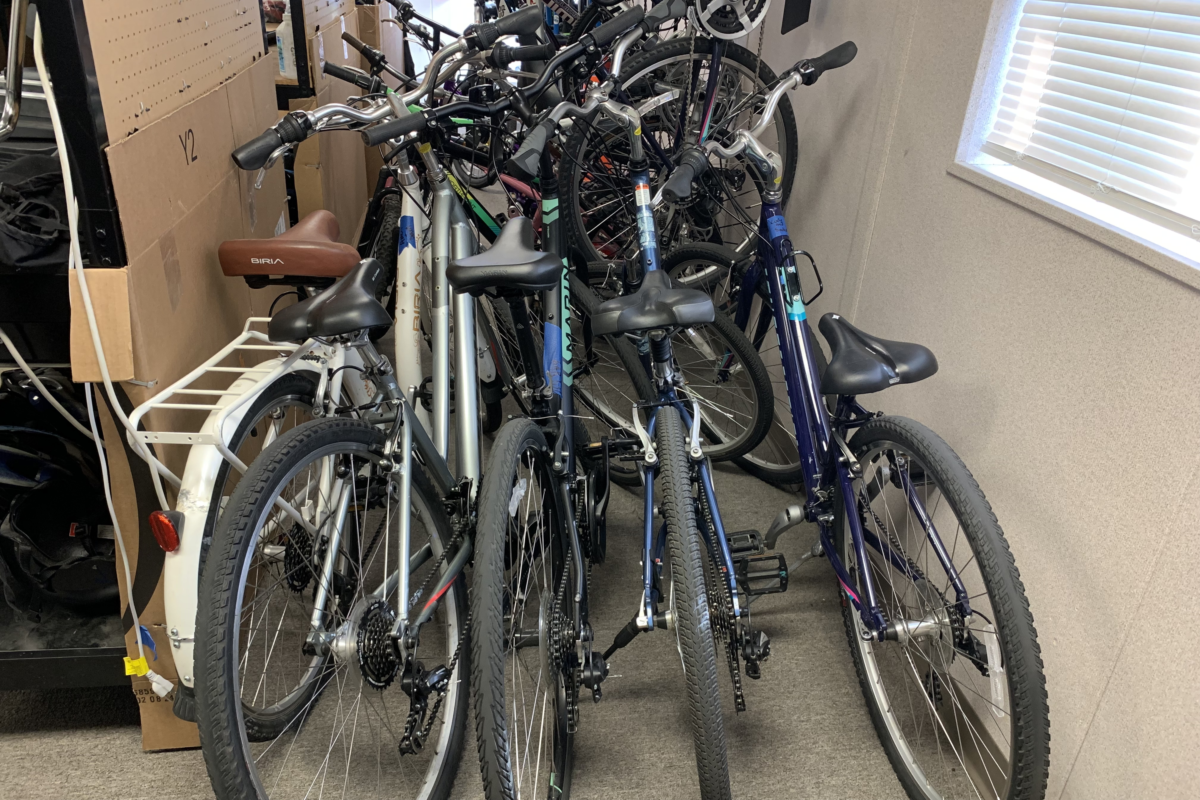 Our first class of the spring season. In the Bike Tech classroom at Inderkum High School, our first task is take out tightly-packed bikes, air up the tires, and take off all the pedals. A busy 45 minutes before people start arriving.
