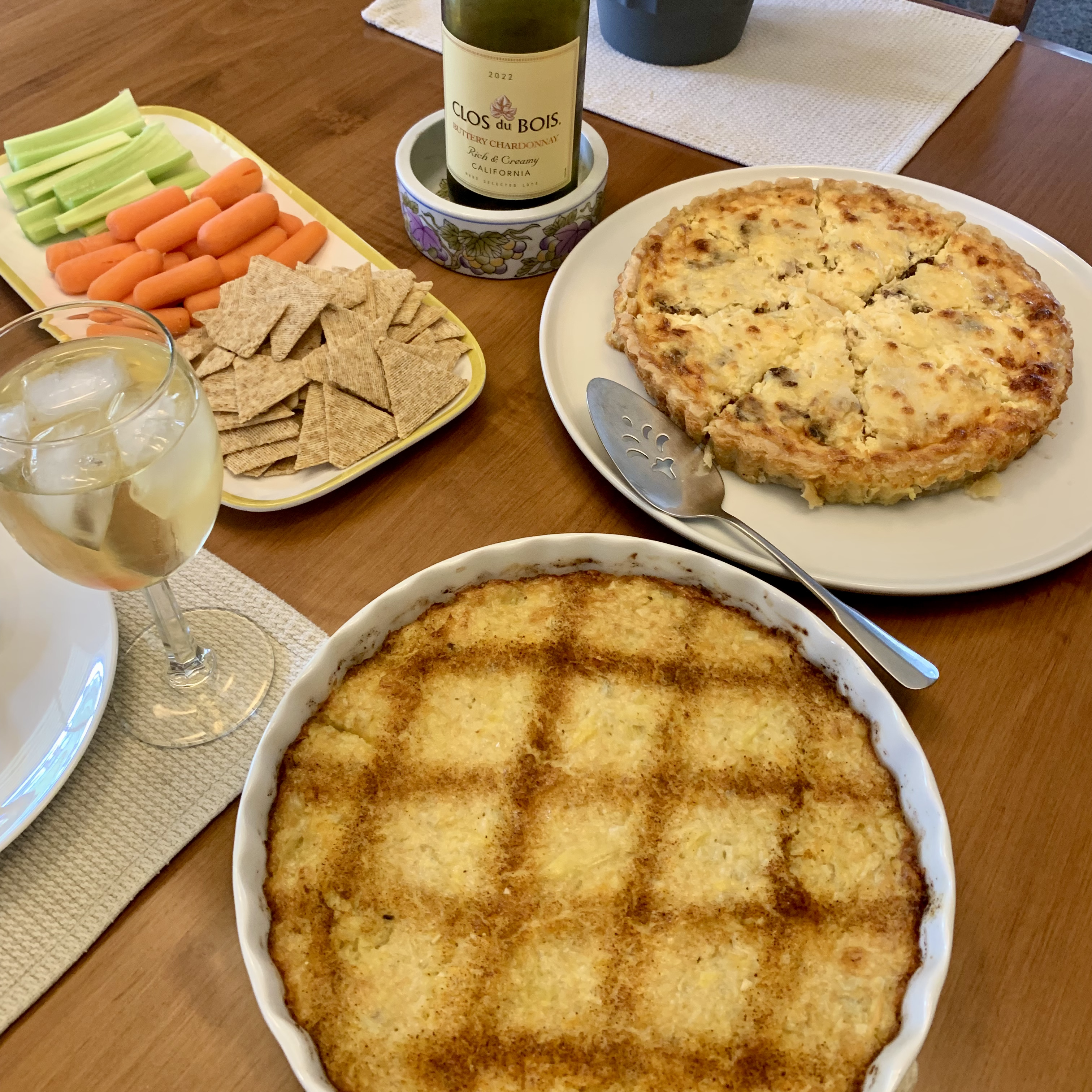 On Tuesday. A delicious quiche and artichoke dip with crackers and veggies. And wine.
