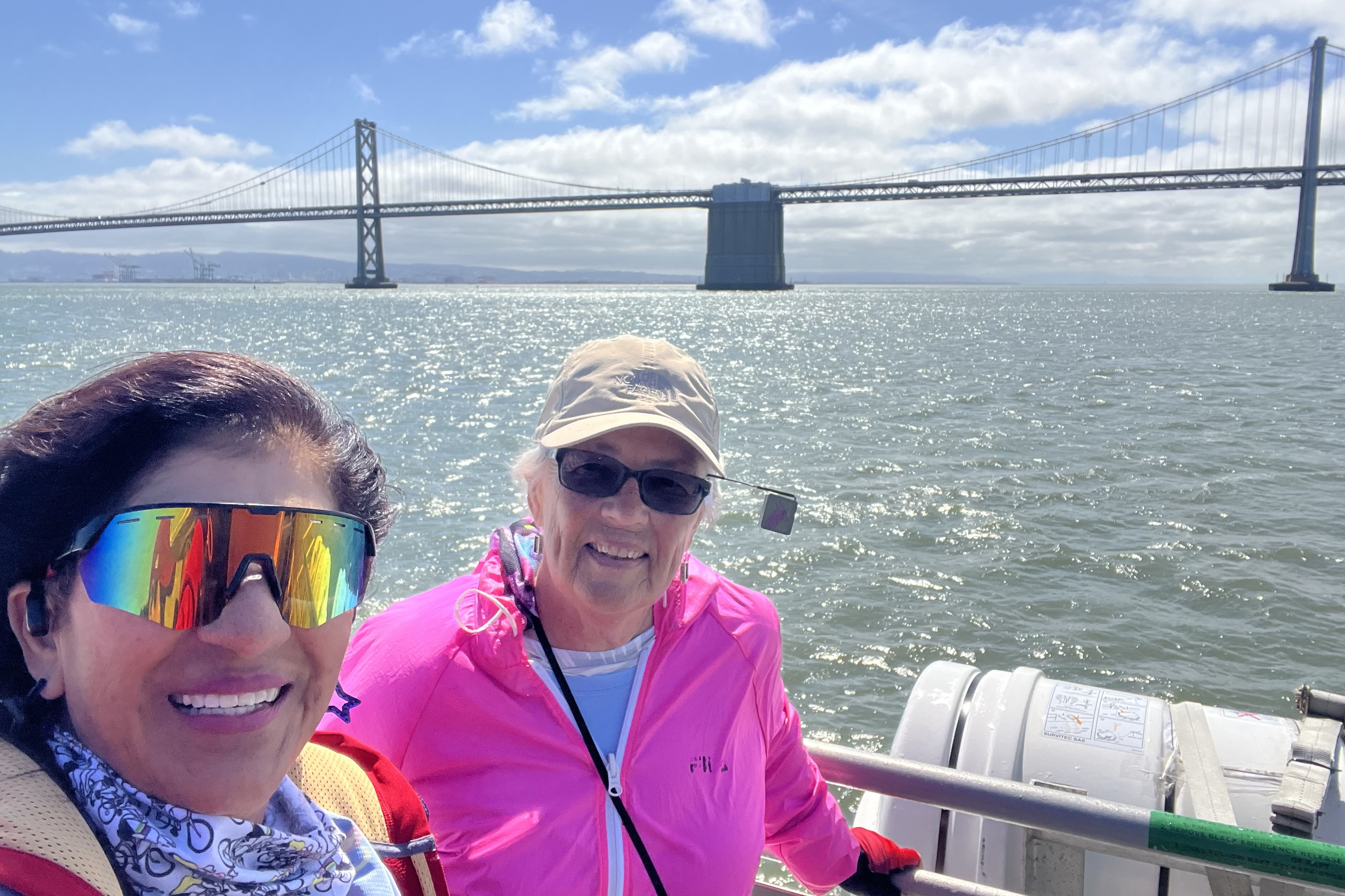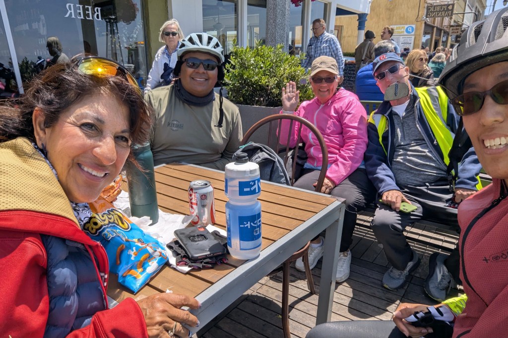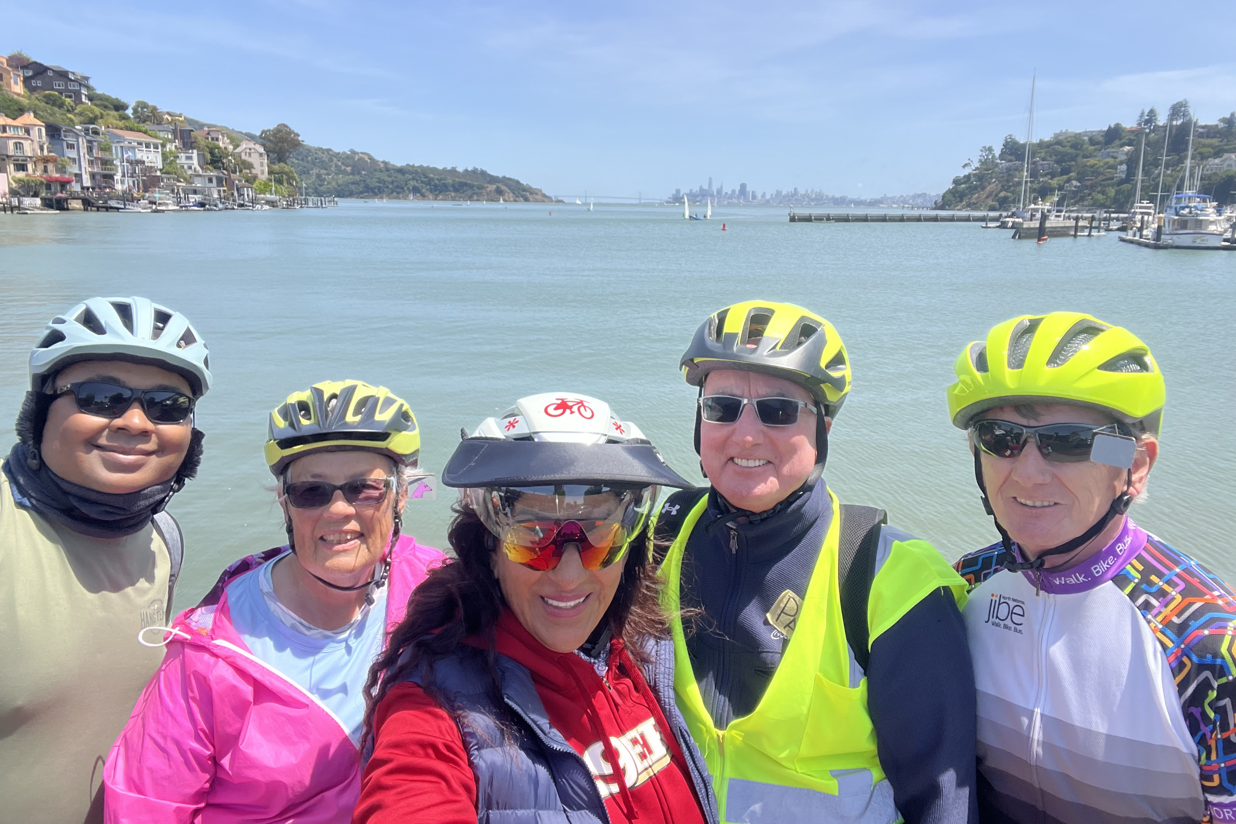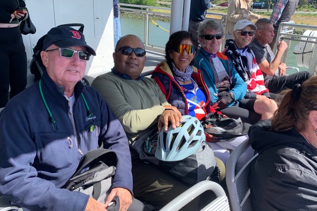 Sheila and I left from my house before 8a and had a fast smooth drive to the Larkspur Ferry Terminal. Seven of us planned to meet here to take the 10a ferry. Unfortunately, BarbaraL went to the Tiburon ferry – oops. And Sheila realized she left her ebike battery in her car which was parked at my house – OOPS – but she decided to persevere. She is a strong rider.