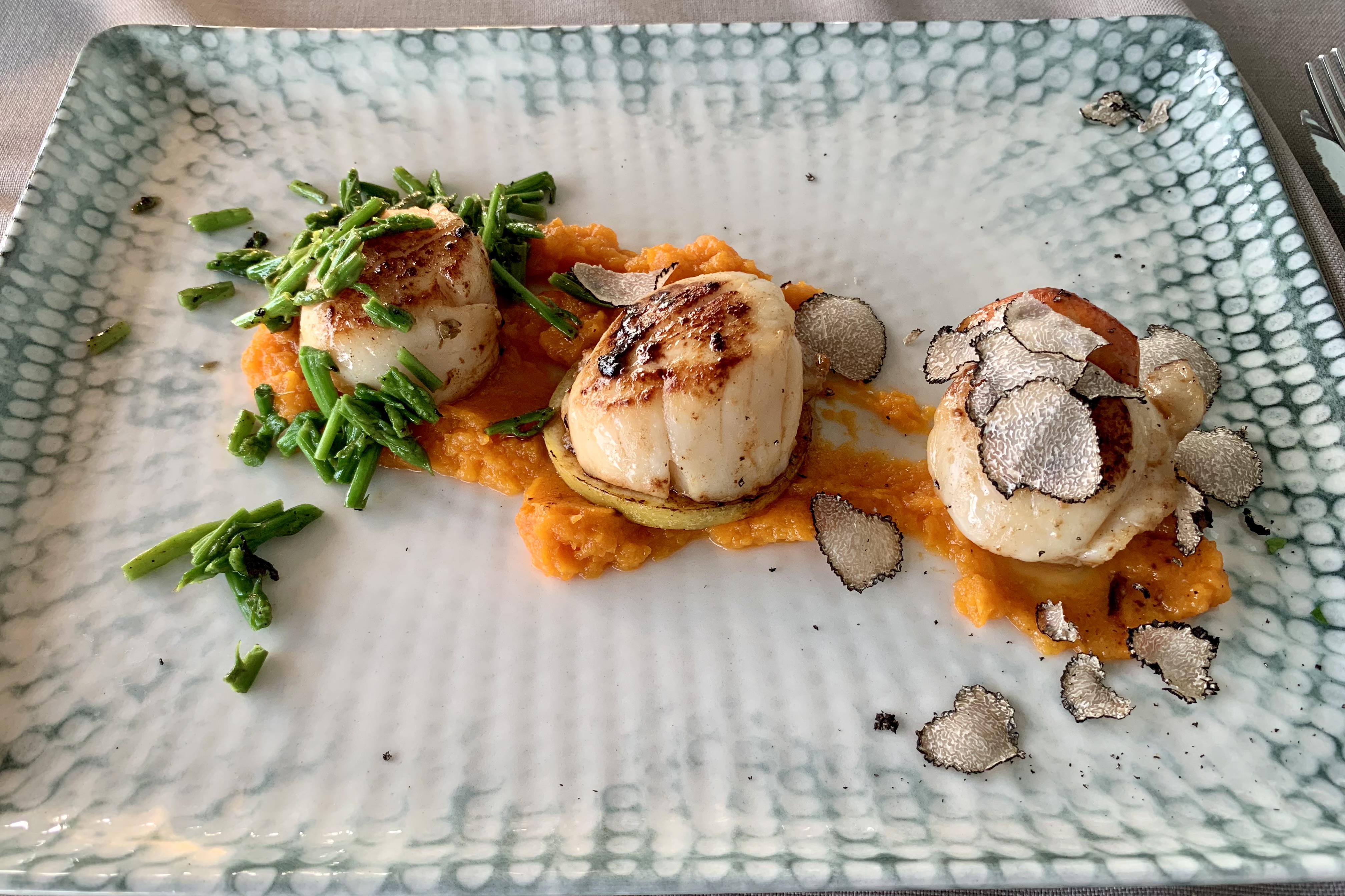 Dinner: scallops three different ways. With wild asparagus (slightly bitter), with lemon, with truffles (pretty but tasteless):