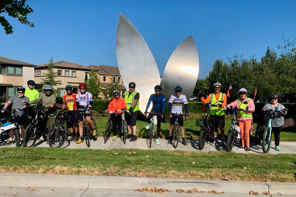 Saturday morning. We met at Peregrine Park and rode the American River Bike Trail to the Guy West Bridge, crossed the river and took a slightly different route back, going through McKInley Village where we stopped for a group picture at the “rabbit ears”.