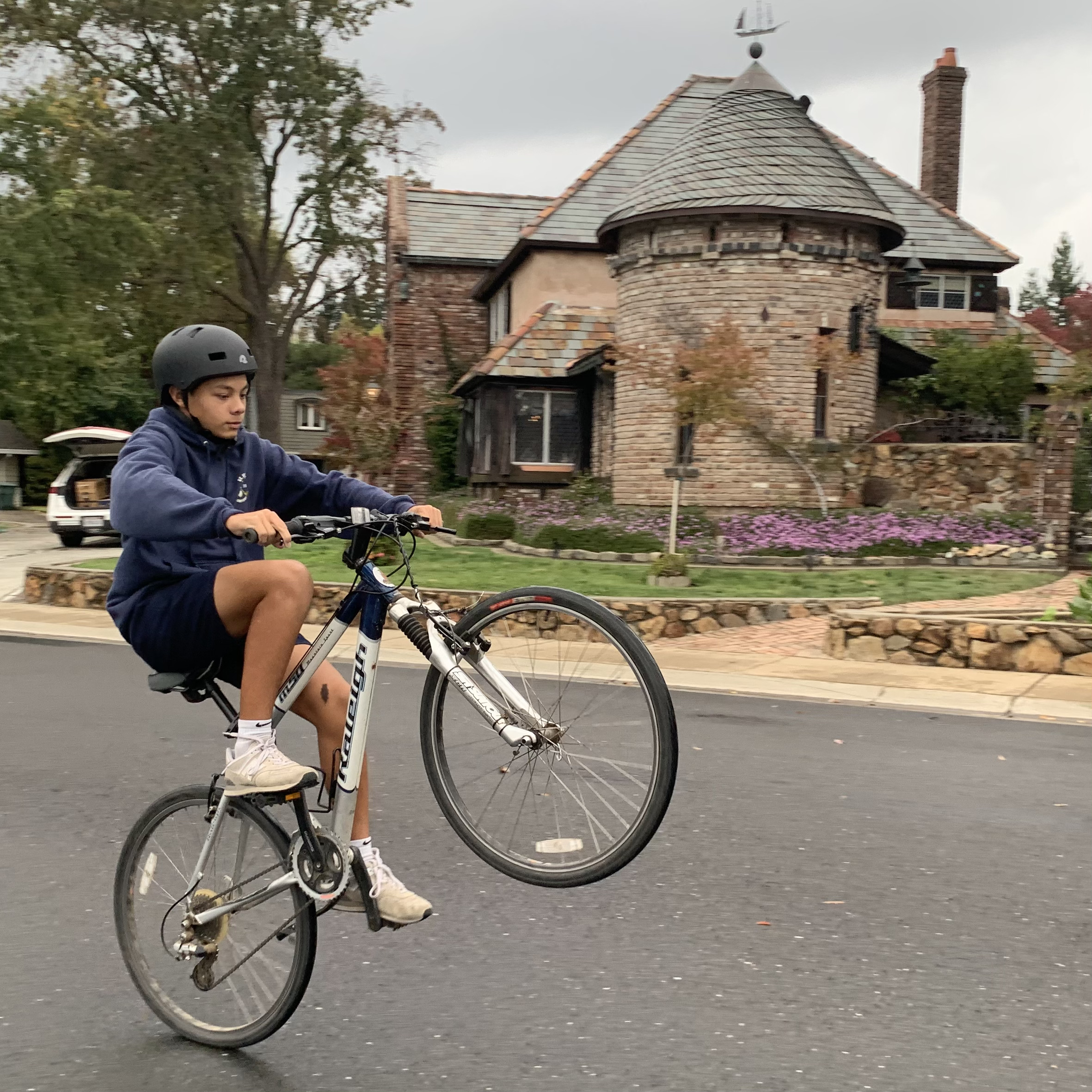 I picked up the boys from St Ignatius after school. Avery is definitely getting better at popping a wheelie.