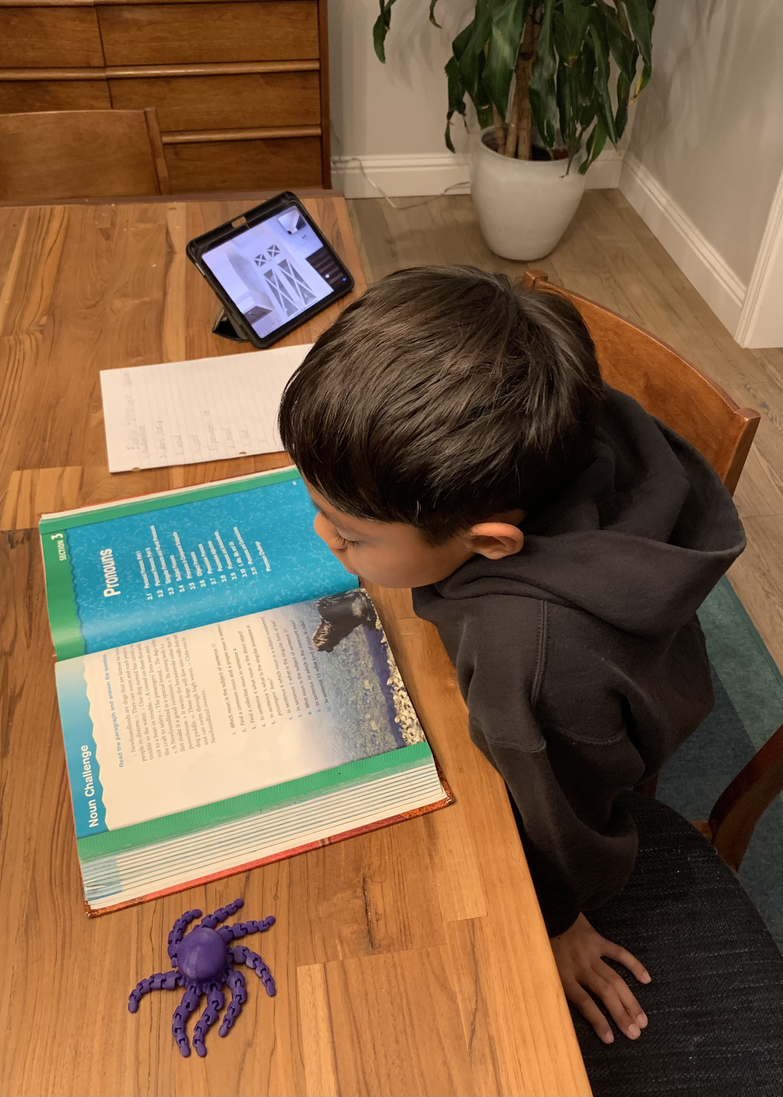 Carson and Hudson were doing their homework together via FaceTime (I think). I couldn’t help but hover a bit, out of curiosity, as they worked on a grammar assignment. Hudson’s mom was on the other end advising him. LOL – she and I both got stuck on sentence 7: find the “noncount noun.”