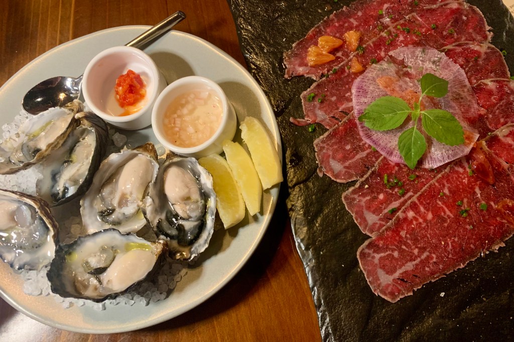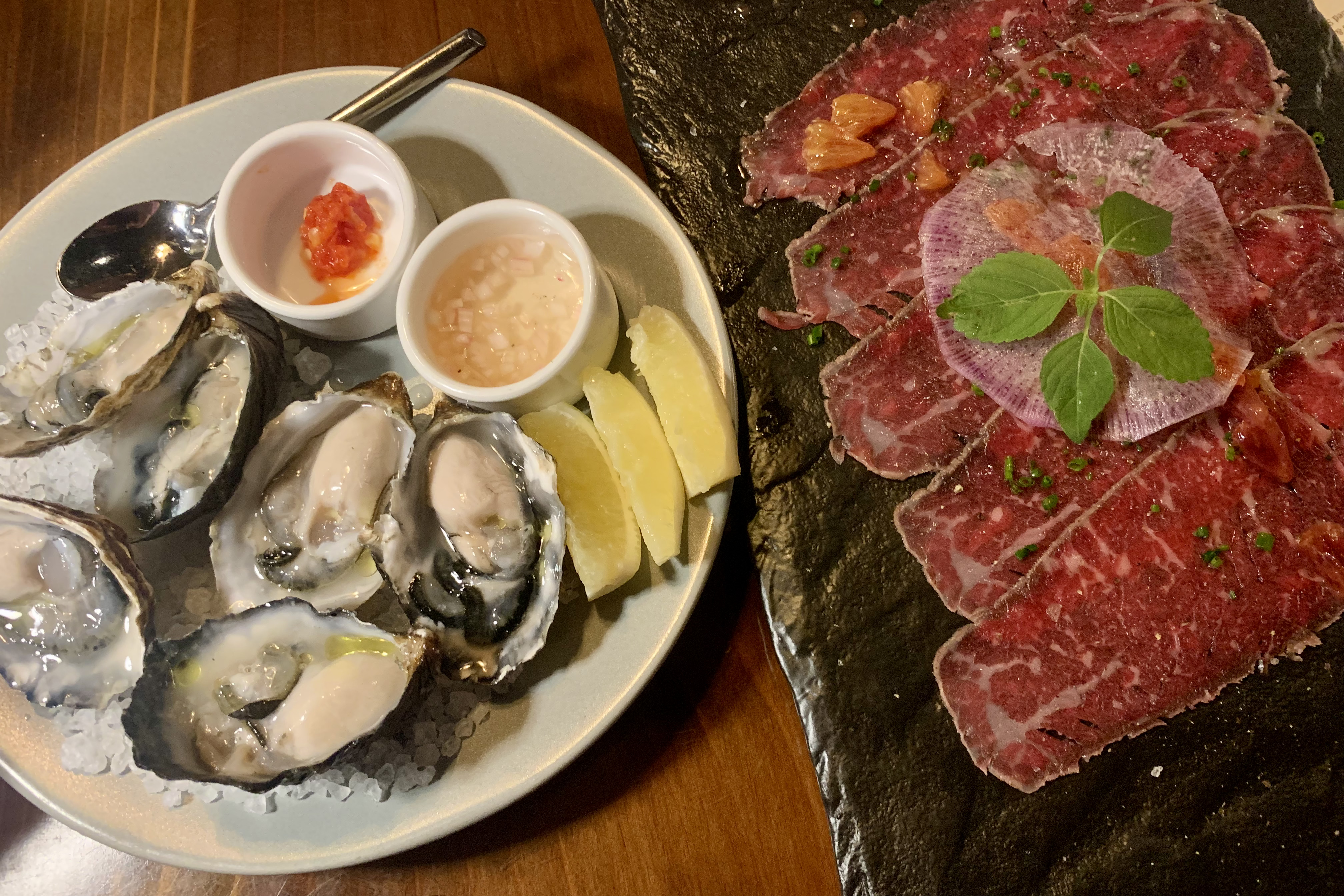 Another wonderful dining experience. From the raw bar: oysters and Wagyu carpaccio.