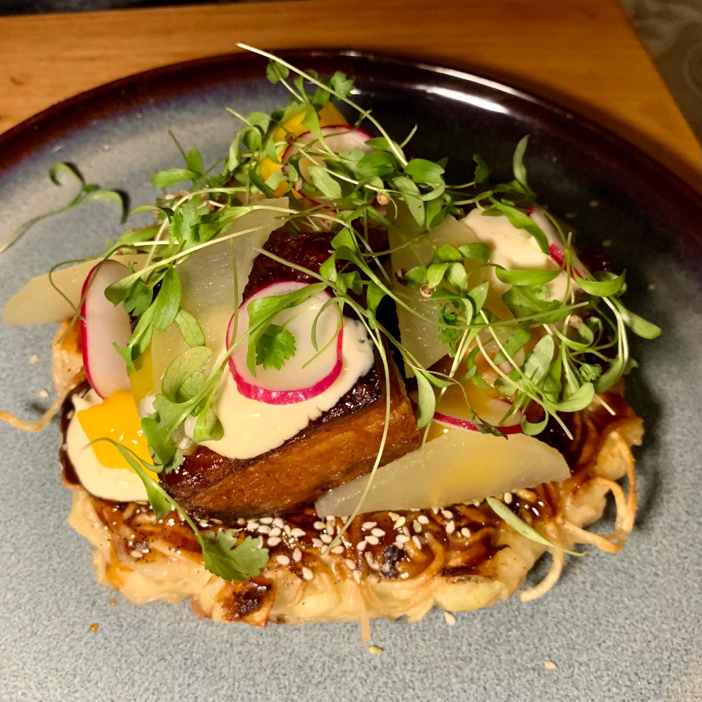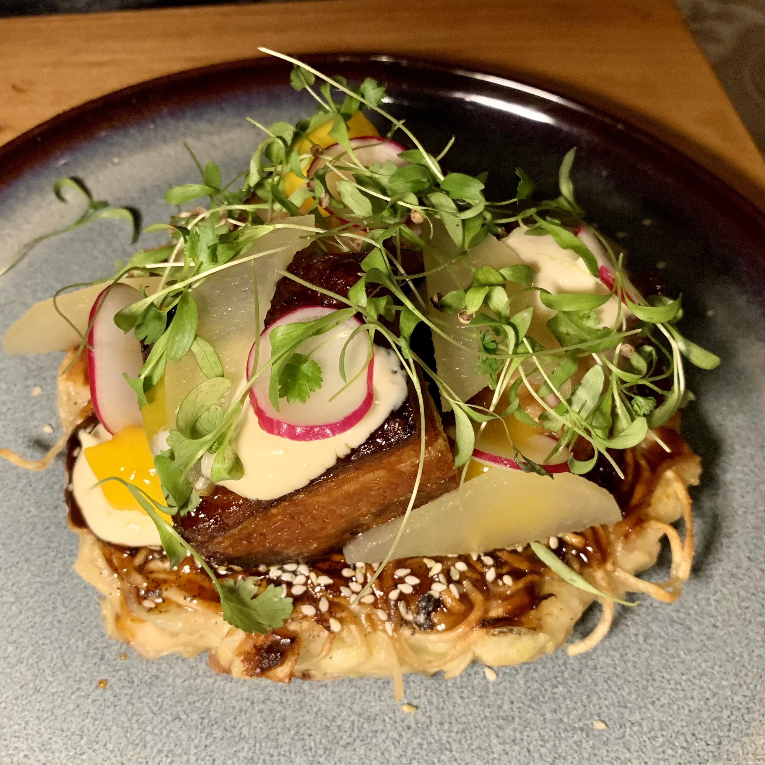 Pork and a pancake: ginger soy-glazed crispy braised pork belly, savory cabbage pancake “okonomiyake” crispy house ramen noodle, asian bbq sauce, shoyu egg yolk jam, yuzu kosho aioli, marinated grannysmith apple, furikake, micro cilantro.