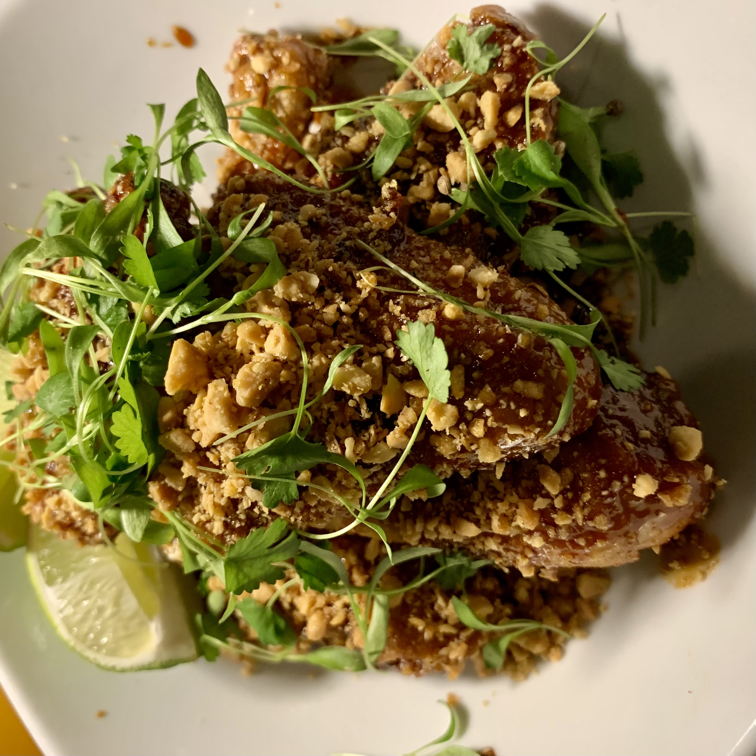 Pok pok bok bok: mary’s chicken (two drums, two thighs. and two double-boned wings) tossed in a Thai sweet and spicy glaze, garlic chips crushed toasted peanuts, micro cilantro and fresh lime. OMG!! Everything was incredibly delicious.