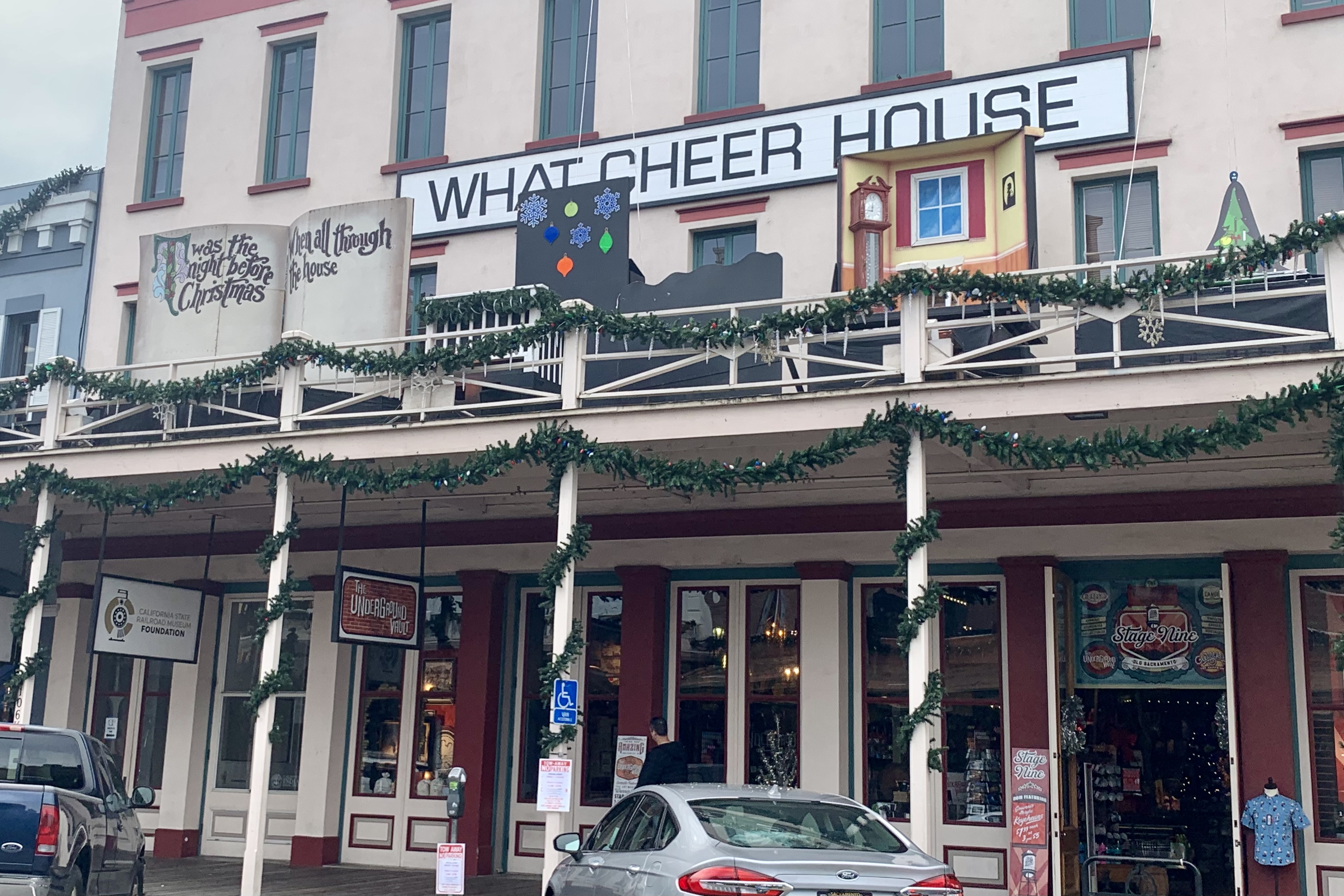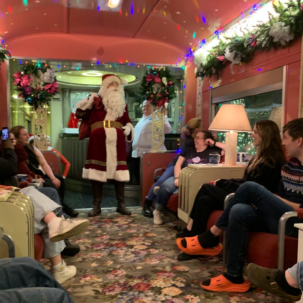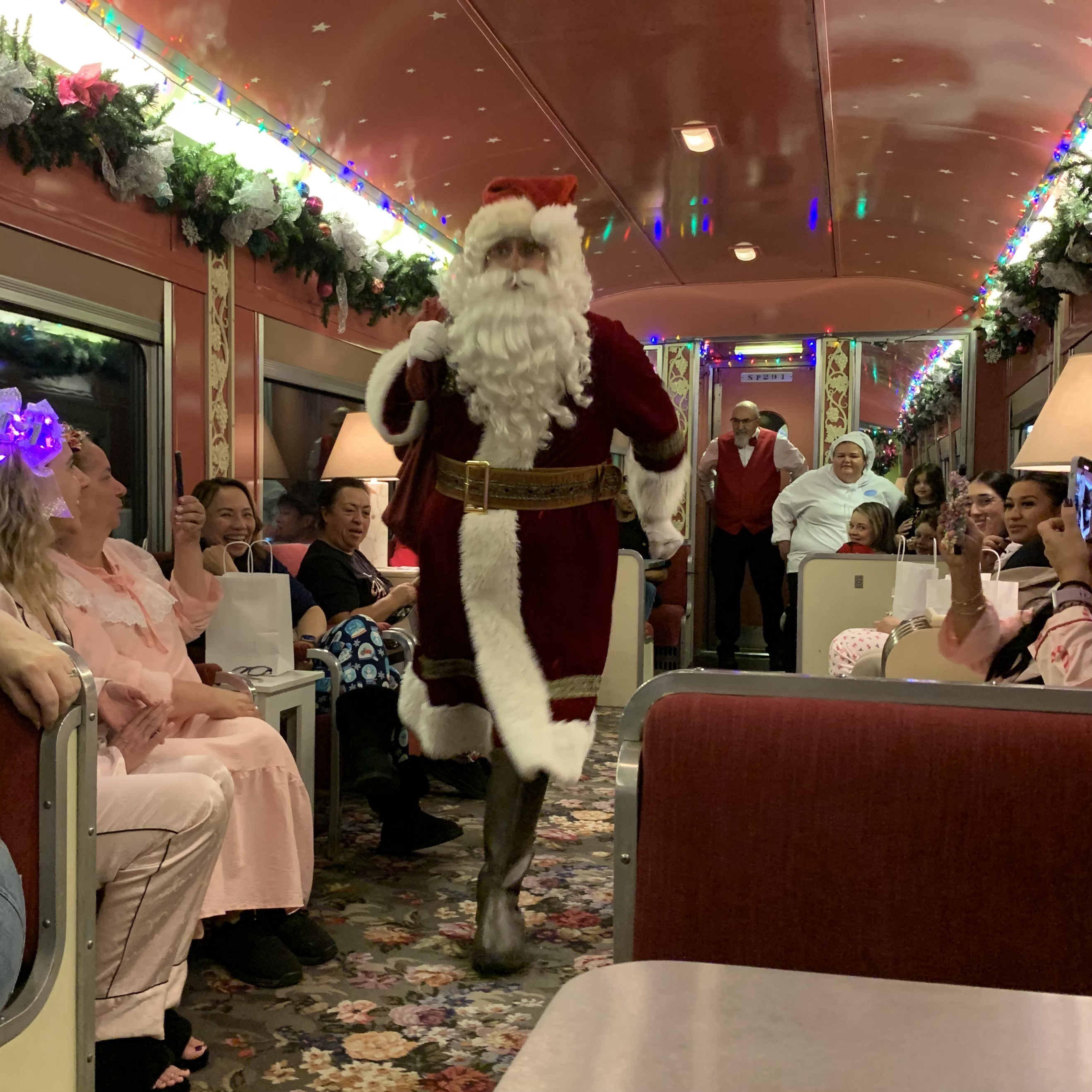 Coming back to the font of the car near the end of the ride. Santa “ran” down the aisle and make to .. ? as the train arrived back in Old Sac.
