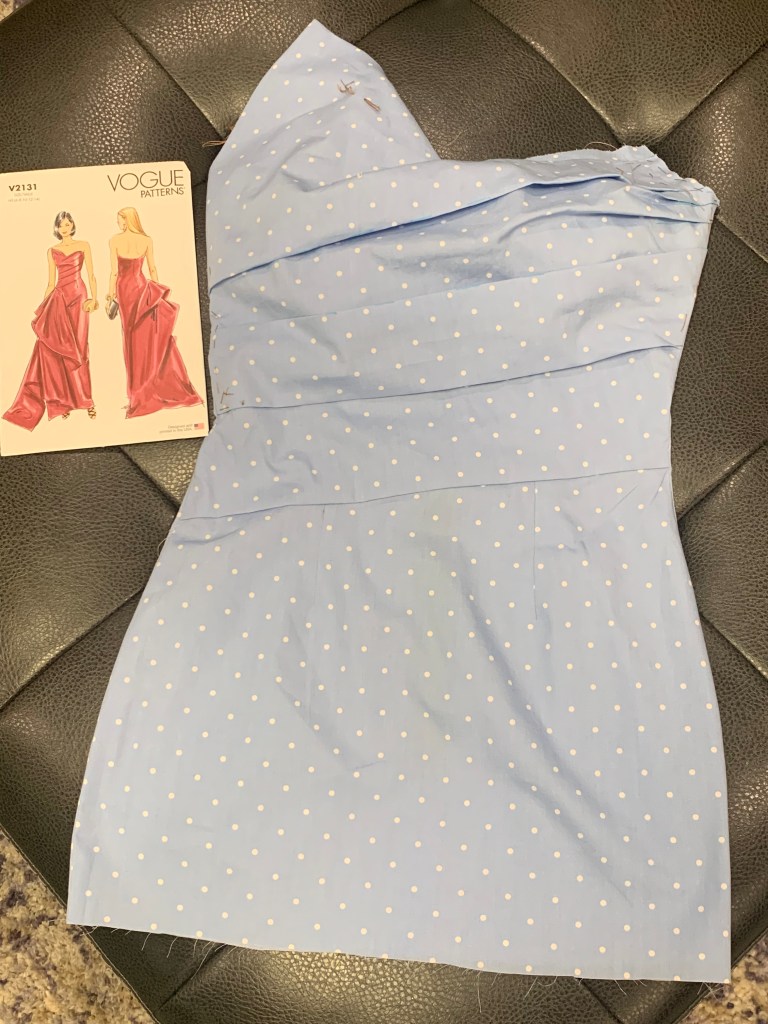 For the last few weeks, I’ve been relearning some dormant sewing skills. I haven’t made formal wear in over 30 years, but now I’m at the beginning of making a prom dress. The prom hasn’t been scheduled yet, but I need to start now .. as in, what if this doesn’t turn out well and Sophia needs to shop for a dress at the last minute. After the pattern arrived, I traced the pieces needed according to her measurements, found some fabric in a drawer that would work, and sewed a “muslin” – a practice garment to check the fit.