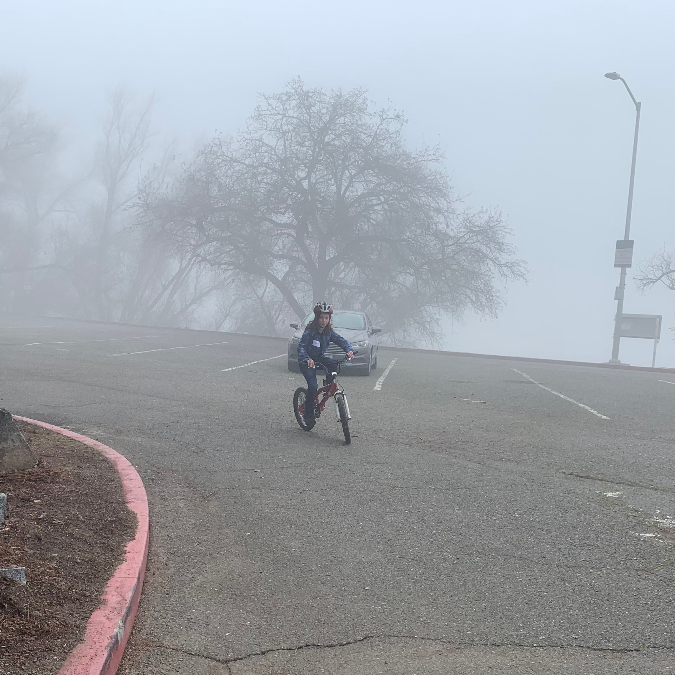 Miller Park on a very foggy Saturday morning. We had six people for the three of us. James was there to practice and get a pre-lesson for his upcoming Project Ride Smart classes at his elementary school. We left the main teaching area and rode the surrounding roads.