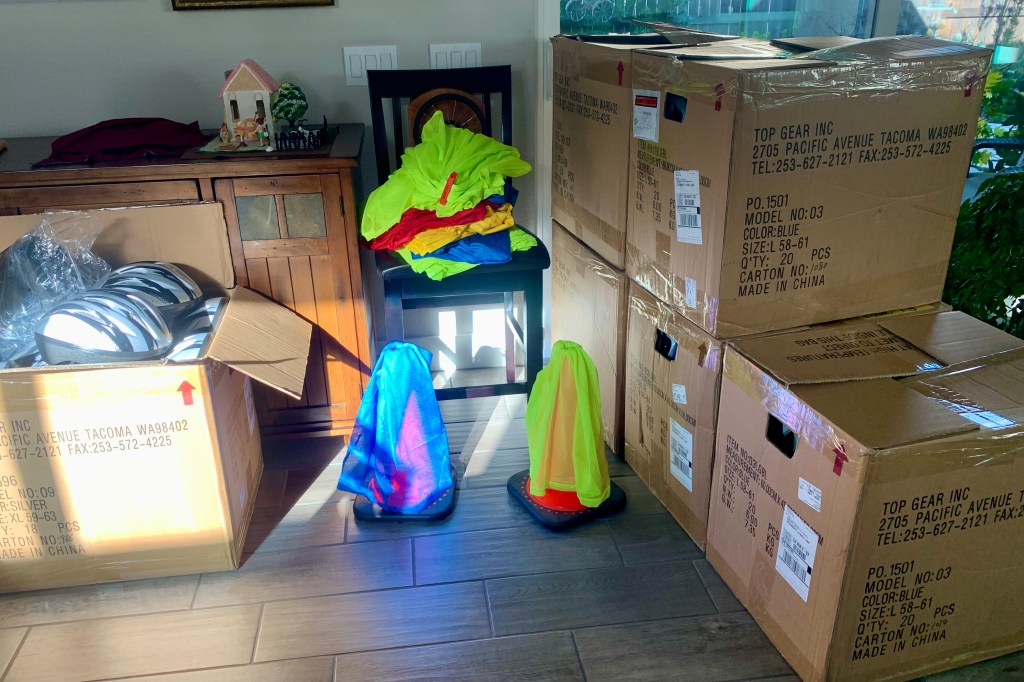 I have been working on curriculum for 4 bicycle safety lessons for all 5th and 4th graders and 2 pedestrian safety lessons for 3rd and 2nd graders at Greer Elementary. This Safe Routes to School grant was funded by CalTrans –> County of Sacramento –> SABA. We just received our official start date for the program so I began ordering supplies: helmets for about 220 kids (15 large brown boxes worth), jerseys and many other supplies, and hiring League Cycling Instructors. My living room was beginning to fill up.