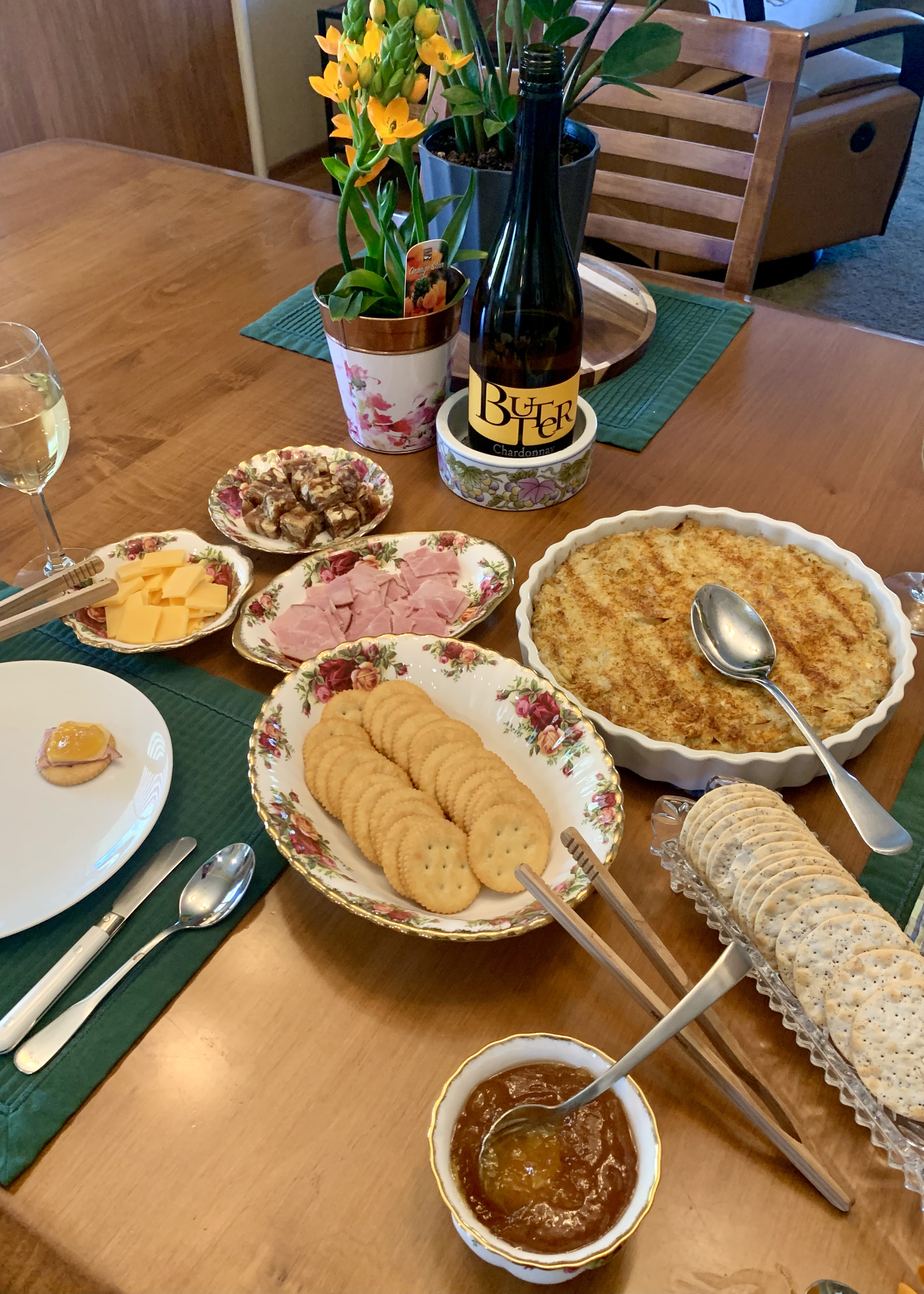 Artichoke dip and Bad Bunny’s favorite snack: Ritz crackers, Black Forest ham, mild cheddar cheese, and pineapple-passion fruit jam.