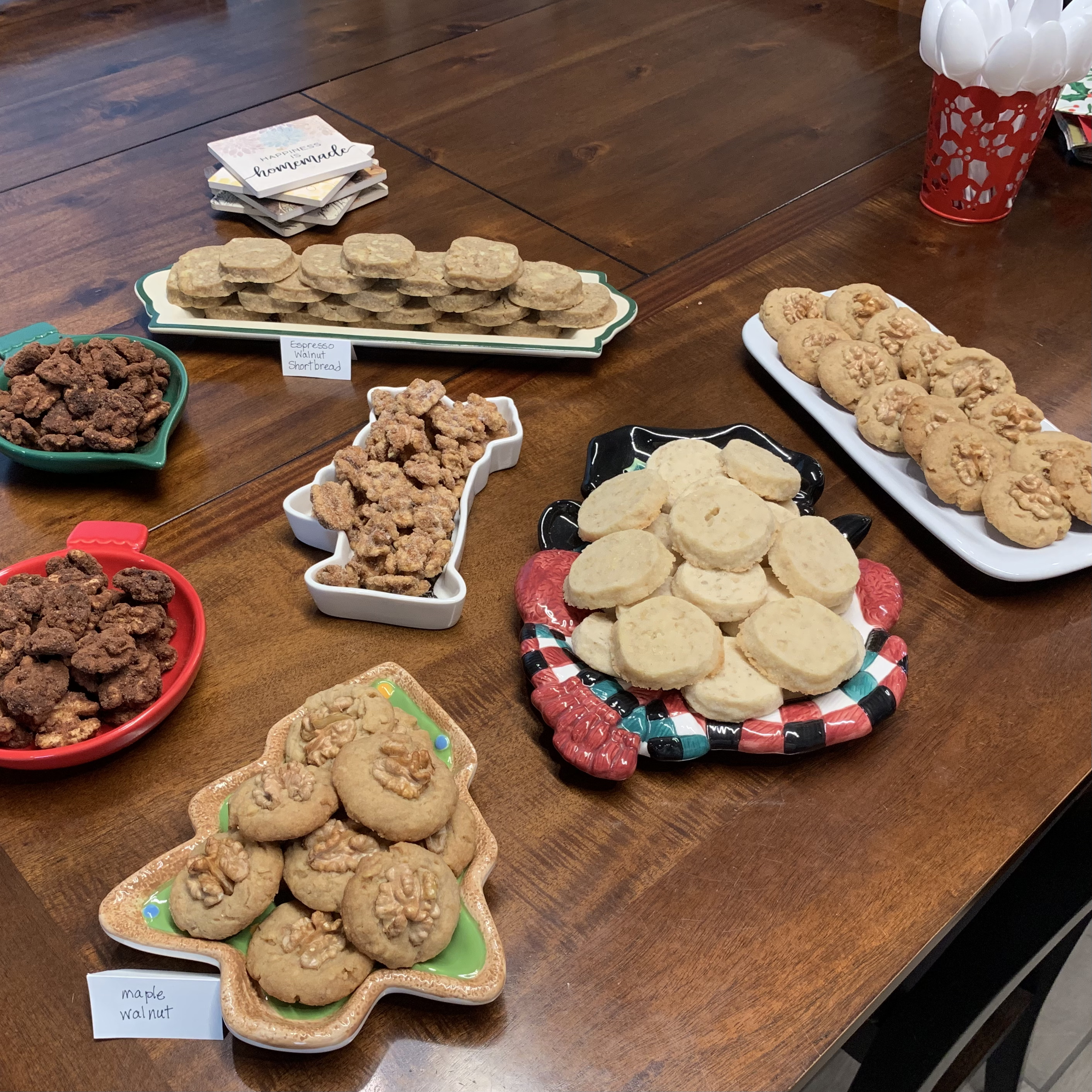 The sweets. Candied walnuts: Mexican mocha and orange brandy. Cookies: German walnut shortbread, maple walnut, espresso walnut shortbread.