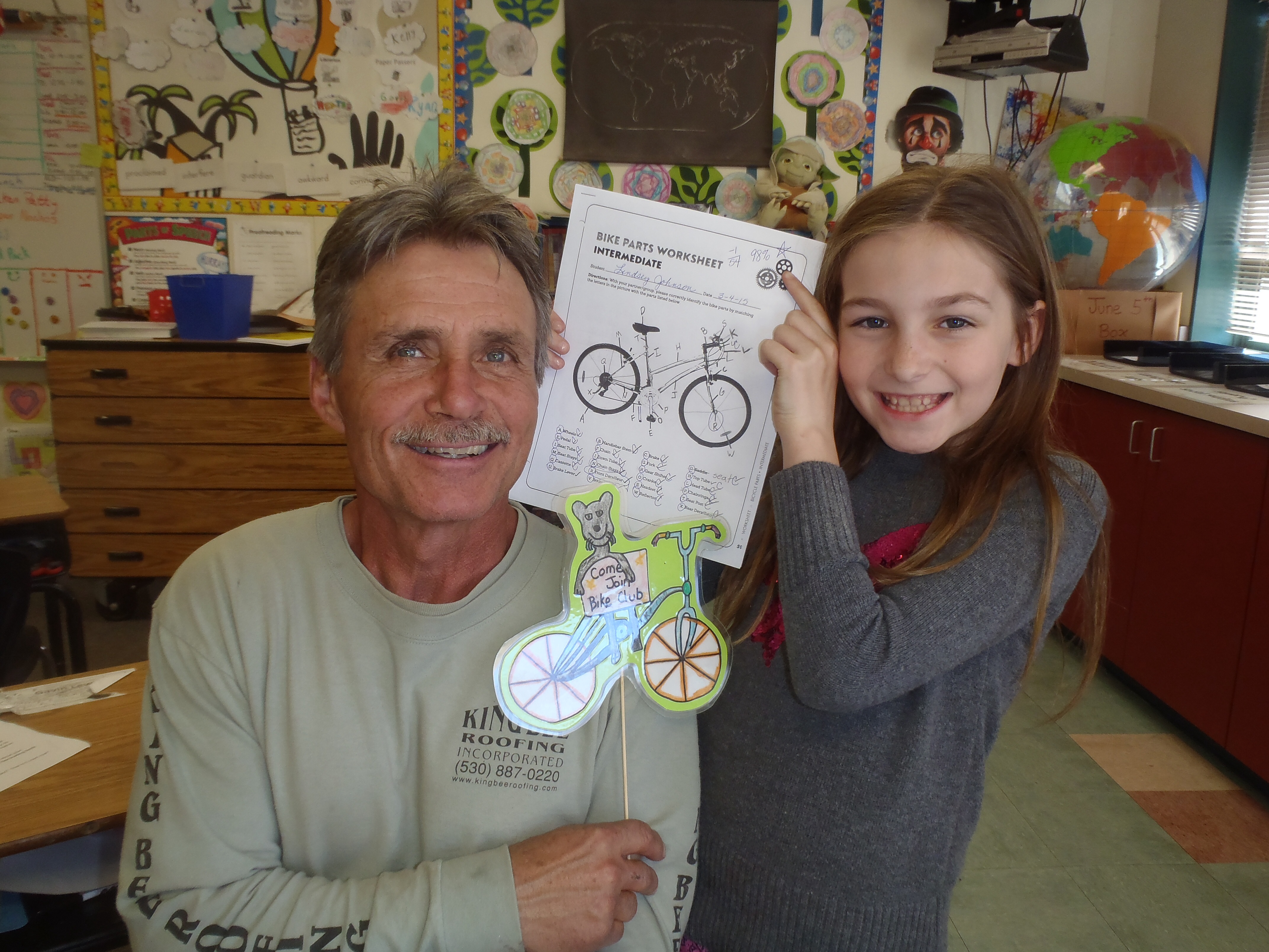 Surprise! Only one student showed up today for bike club today. It was, as everyone seems to be calling it, a “pencil day.” Lindsey is surely the #1 member of the club and her dad Brian is a Parent Champion. Lindsey drew a great picture of the school mascot, a panther, riding a bicycle and inviting people to join the bike club. And she’s showing her 98% score on the Intermediate Bicycle Parts Test. Brian comes to all our club meetings and helps in any way needed. He’s frequently the photographer.