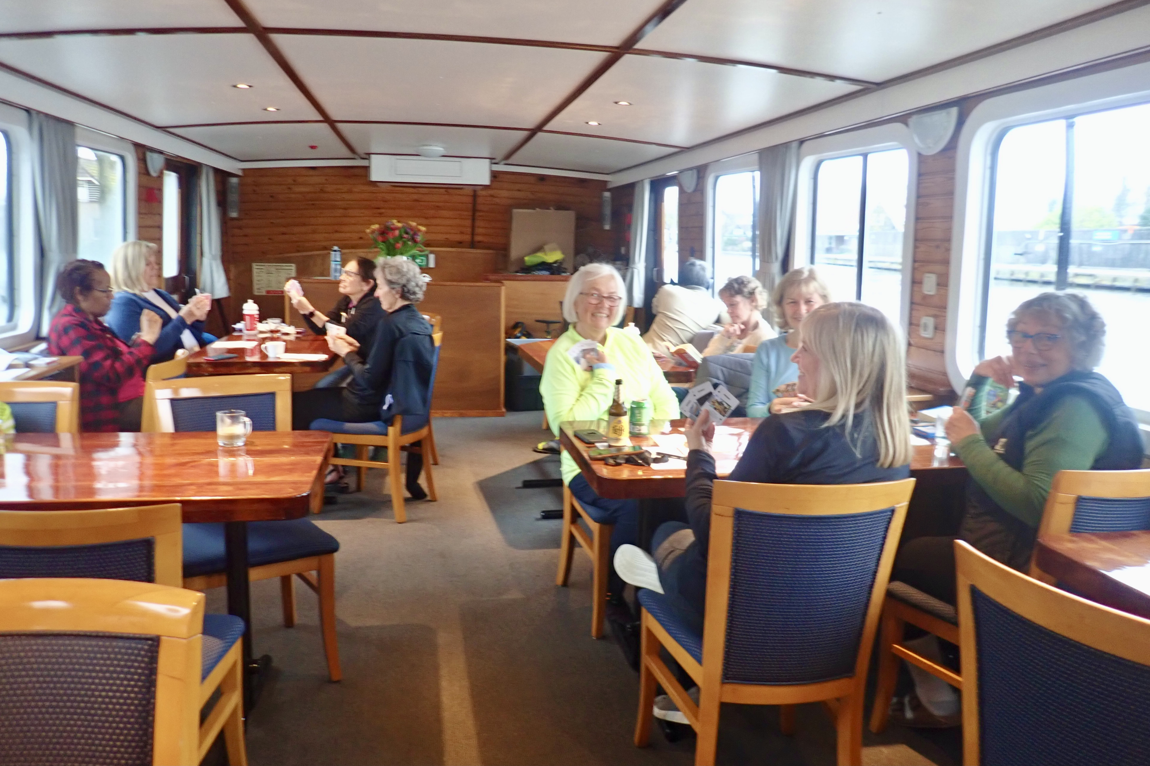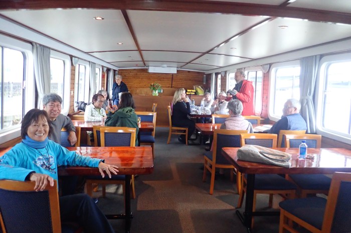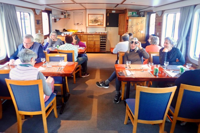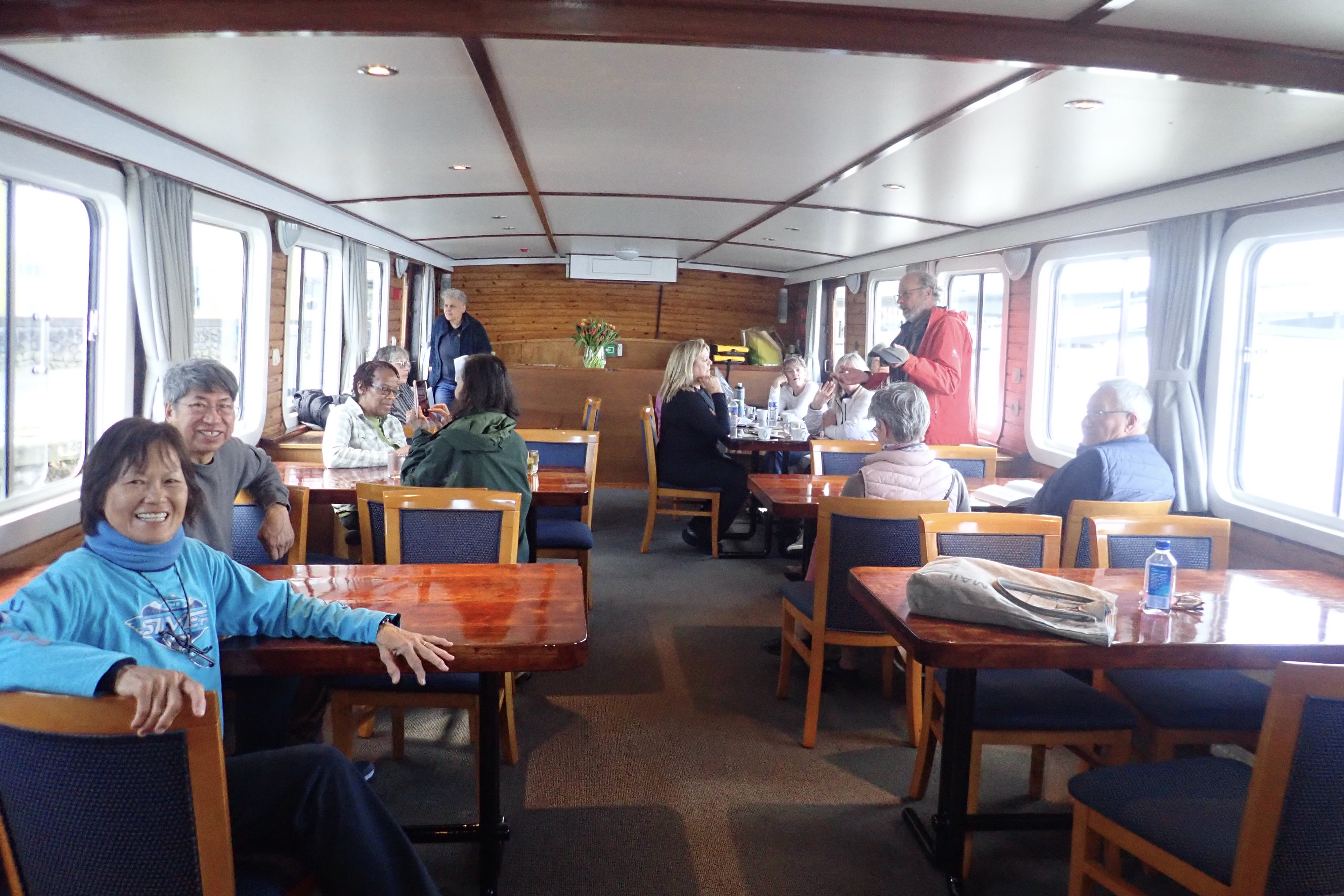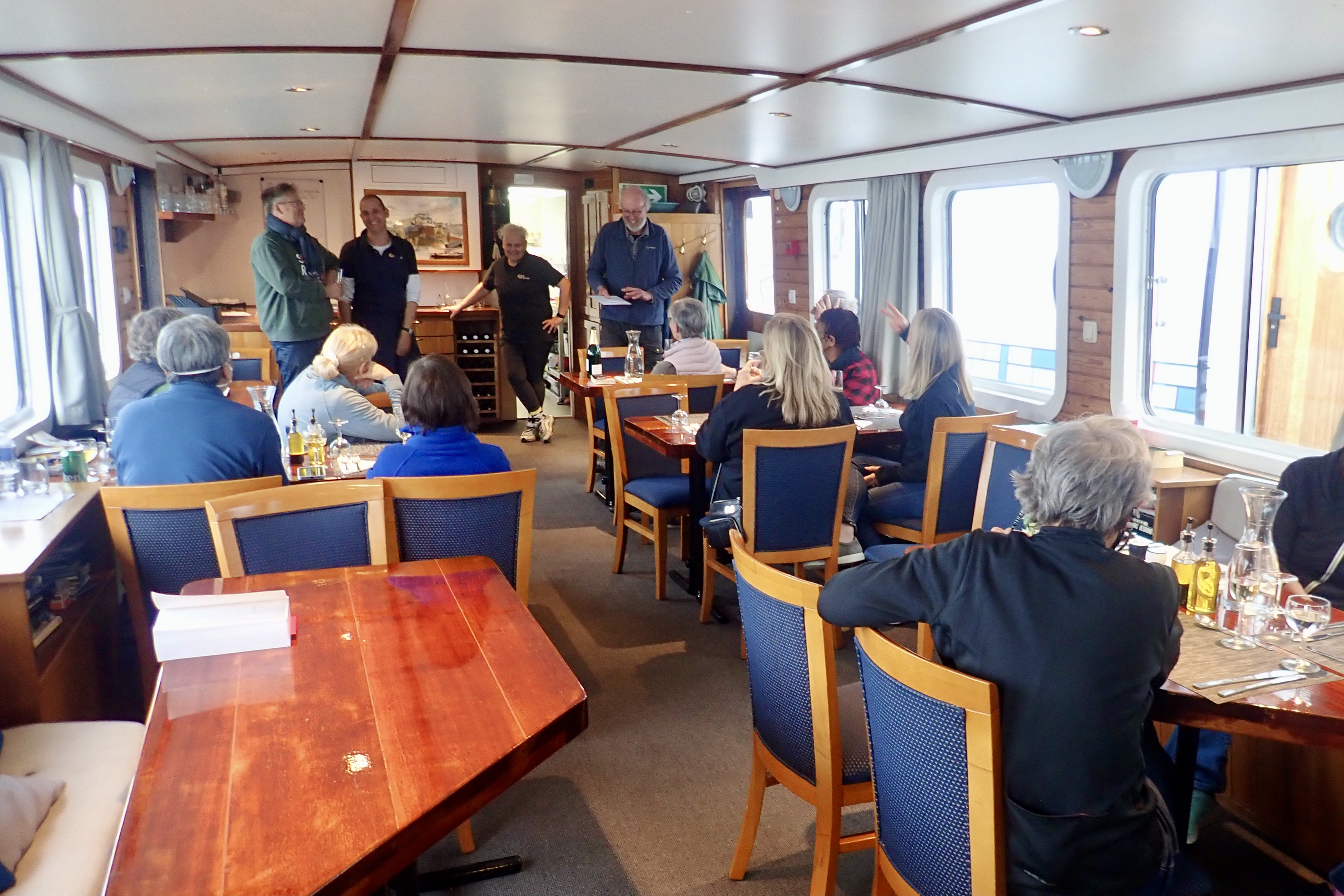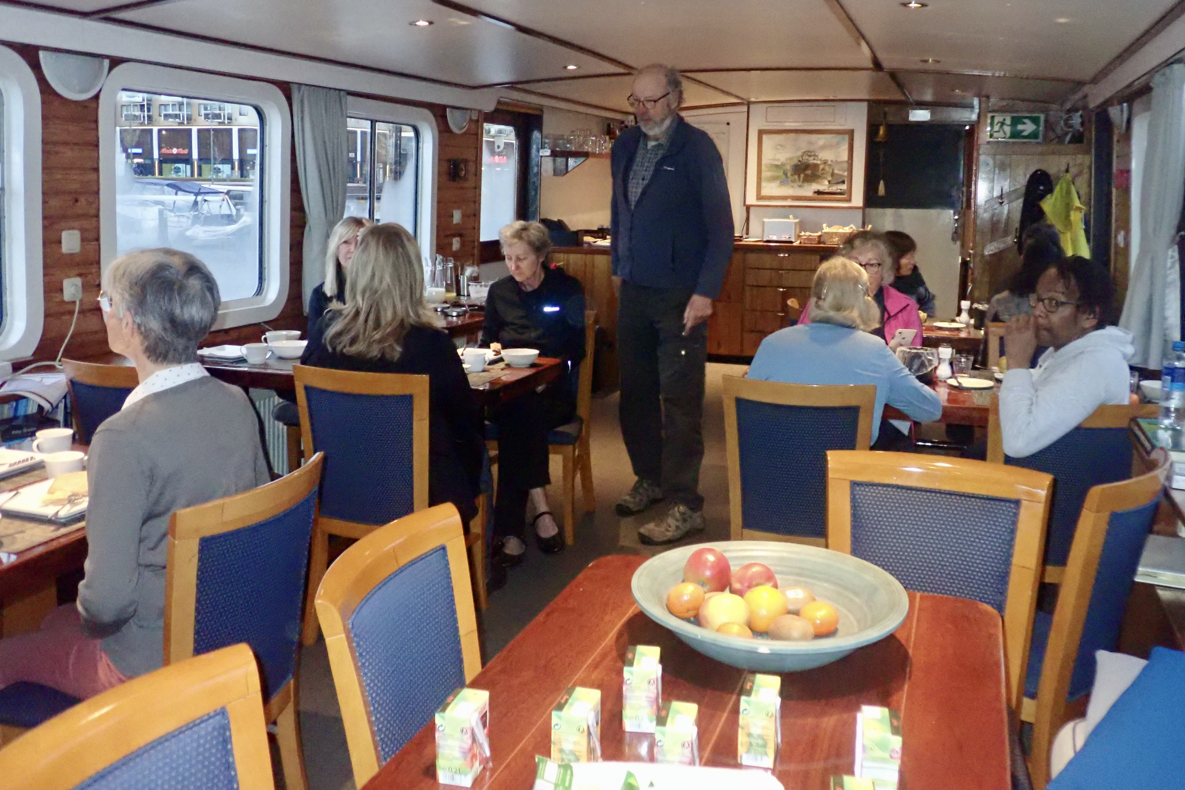 After one more round-trip walk for me to find the last two members of our group – who had taken a taxi to the correct dock, but I didn’t know that – we assembled in the salon. Pietr (red jacket) will be our cycling guide.
