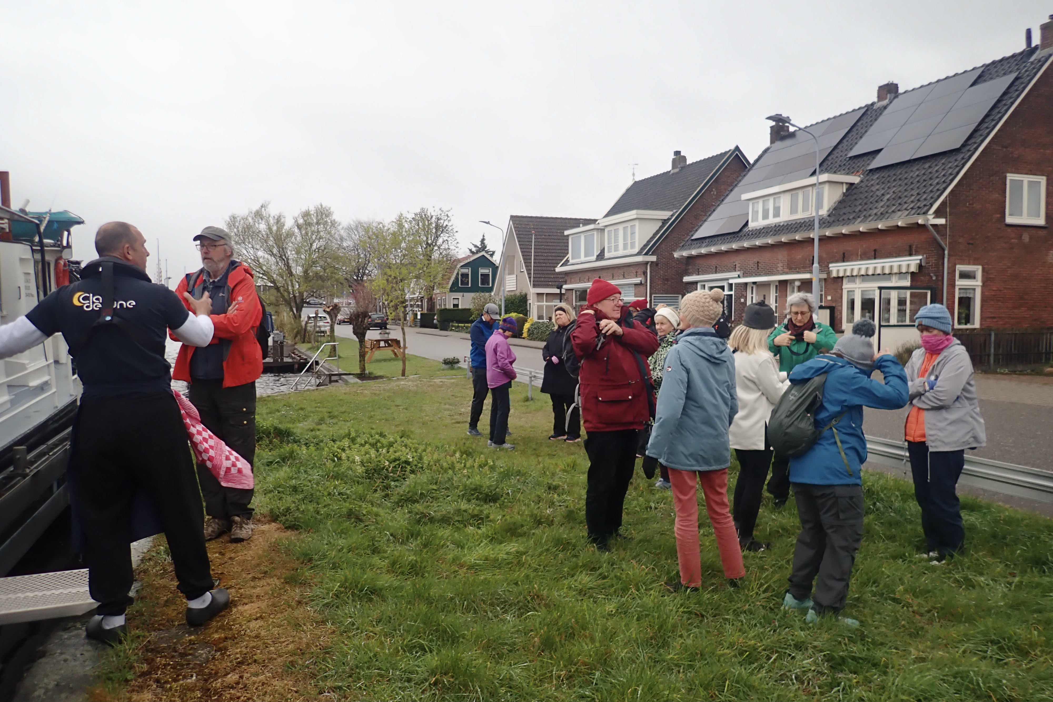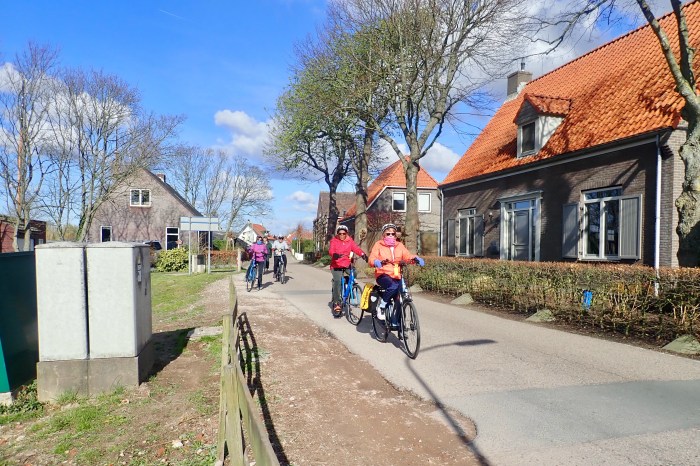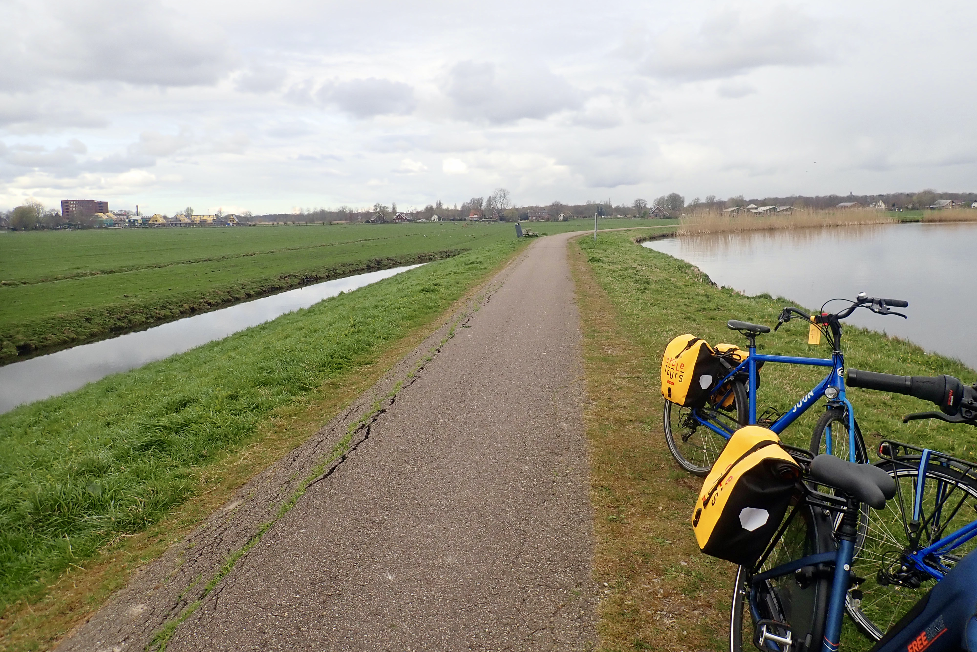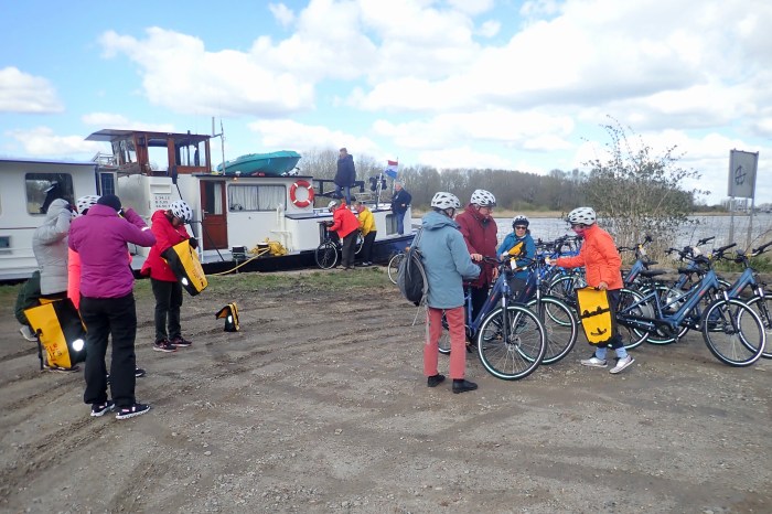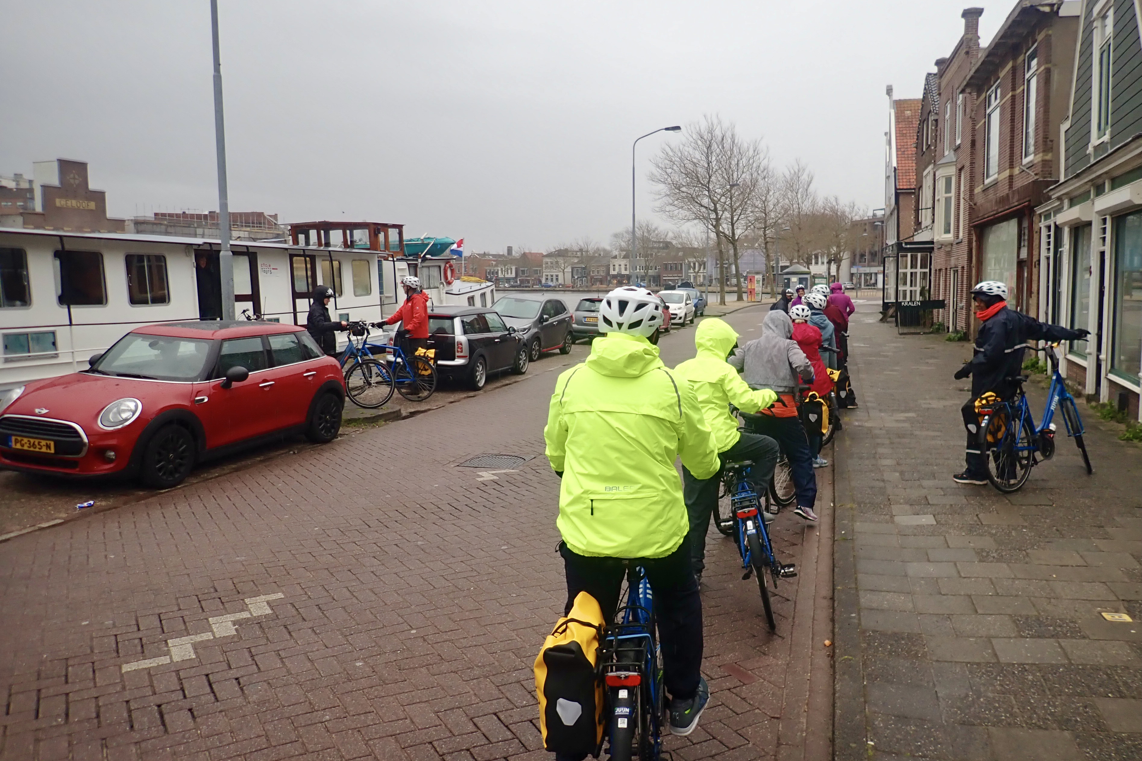 We motored out of Amsterdam and left the big city behind. At a canal-side stopping place, the bikes were unloaded (10 e-bikes and 4 bikes not). All bikes had been labeled with our names – a good idea because they all look alike.