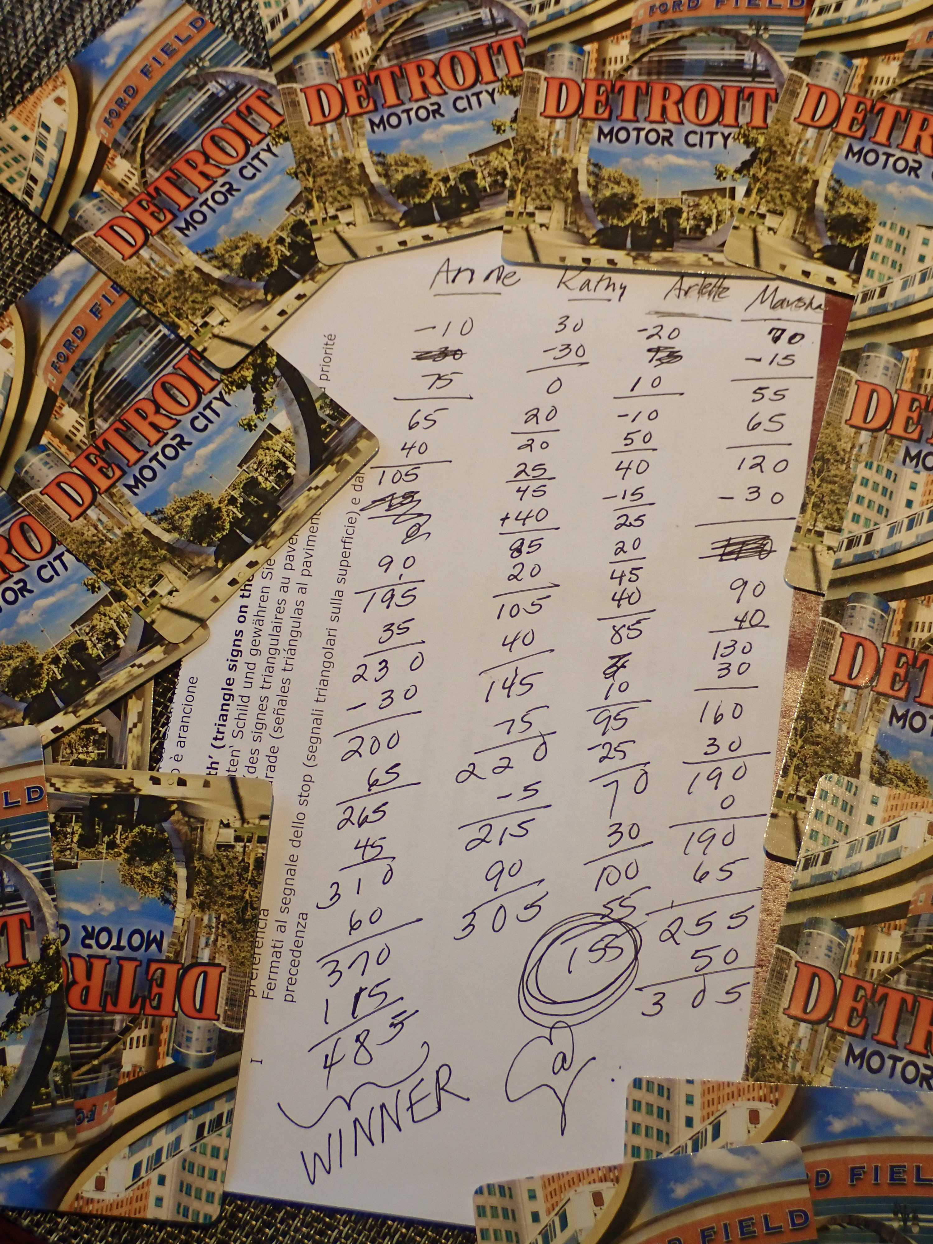 Anne: big winner and the best at calling out “Rummy.” Thankfully we found a deck of cards with American markings because we couldn’t remember the Dutch face cards: B=Jack, V=Queen, H=King. The beer and wine might have been a factor but switching to the Detroit cards made things easier. I lost, by the way.