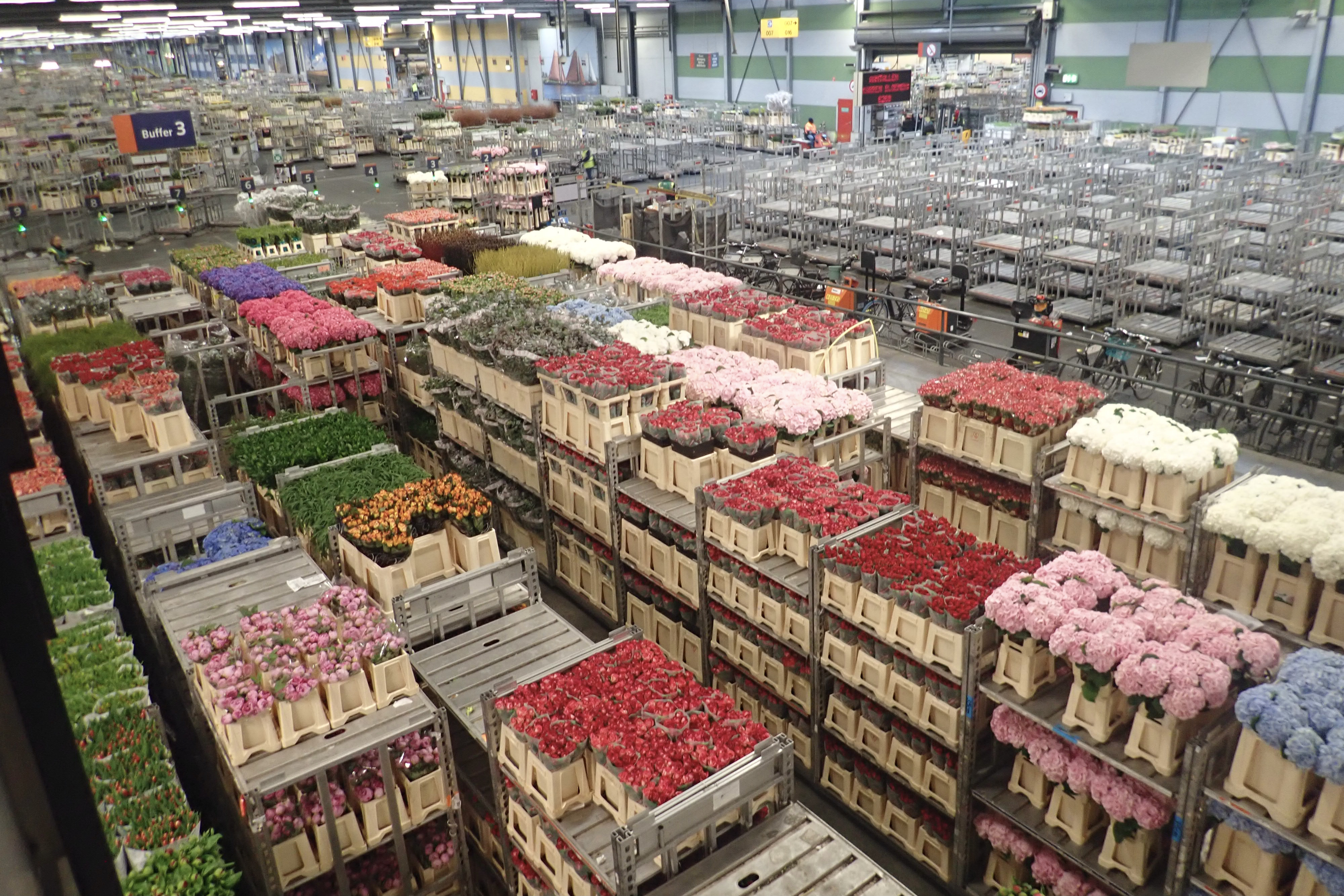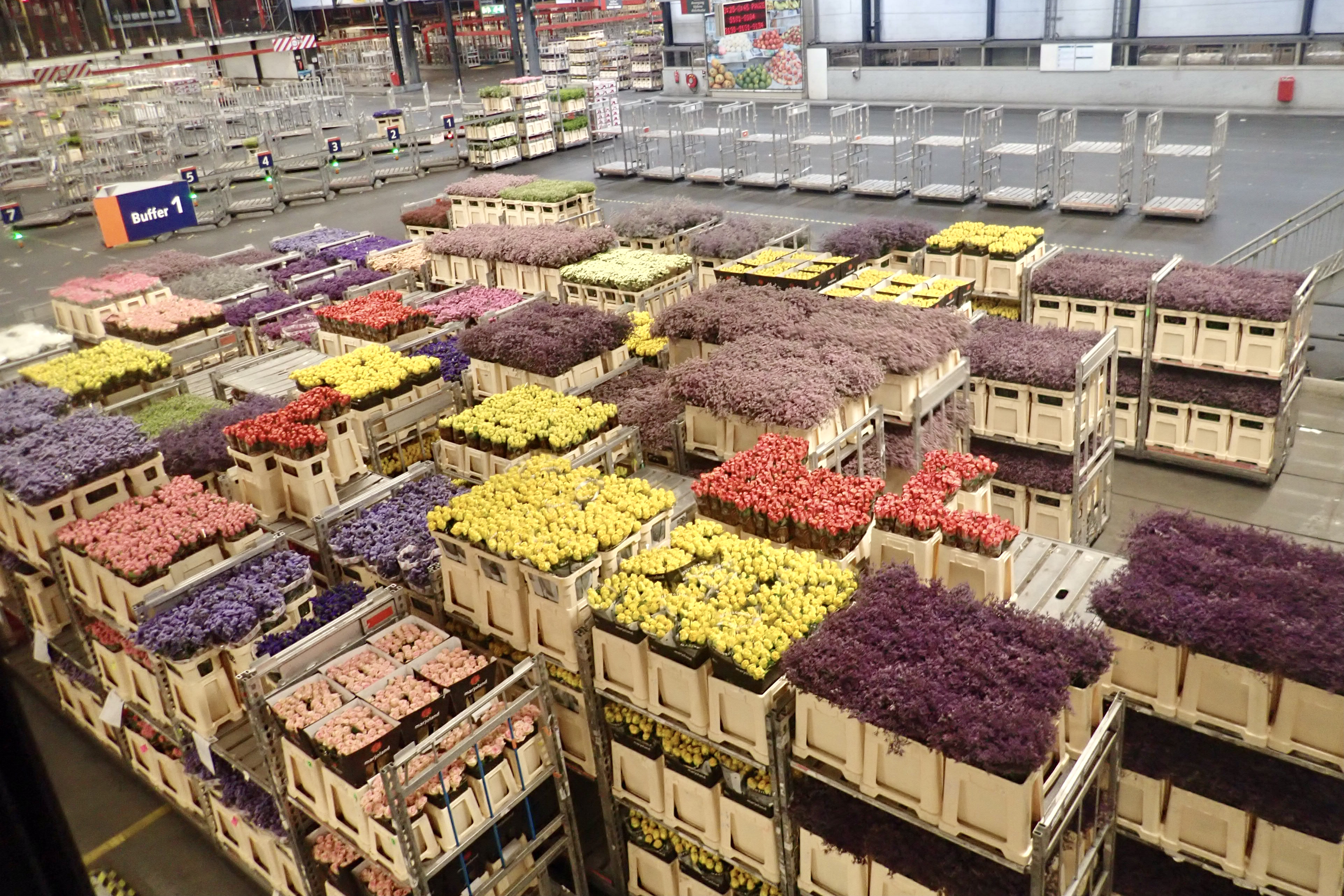 to Flora Holland, the world’s largest international trade center for flowers and plants supplied by growers and purchased by traders. This auction is 24/7 all year long, the building is 1/2 mile long and 1/2 mile wide. Flowers by type are on one side (of the walkway we followed).