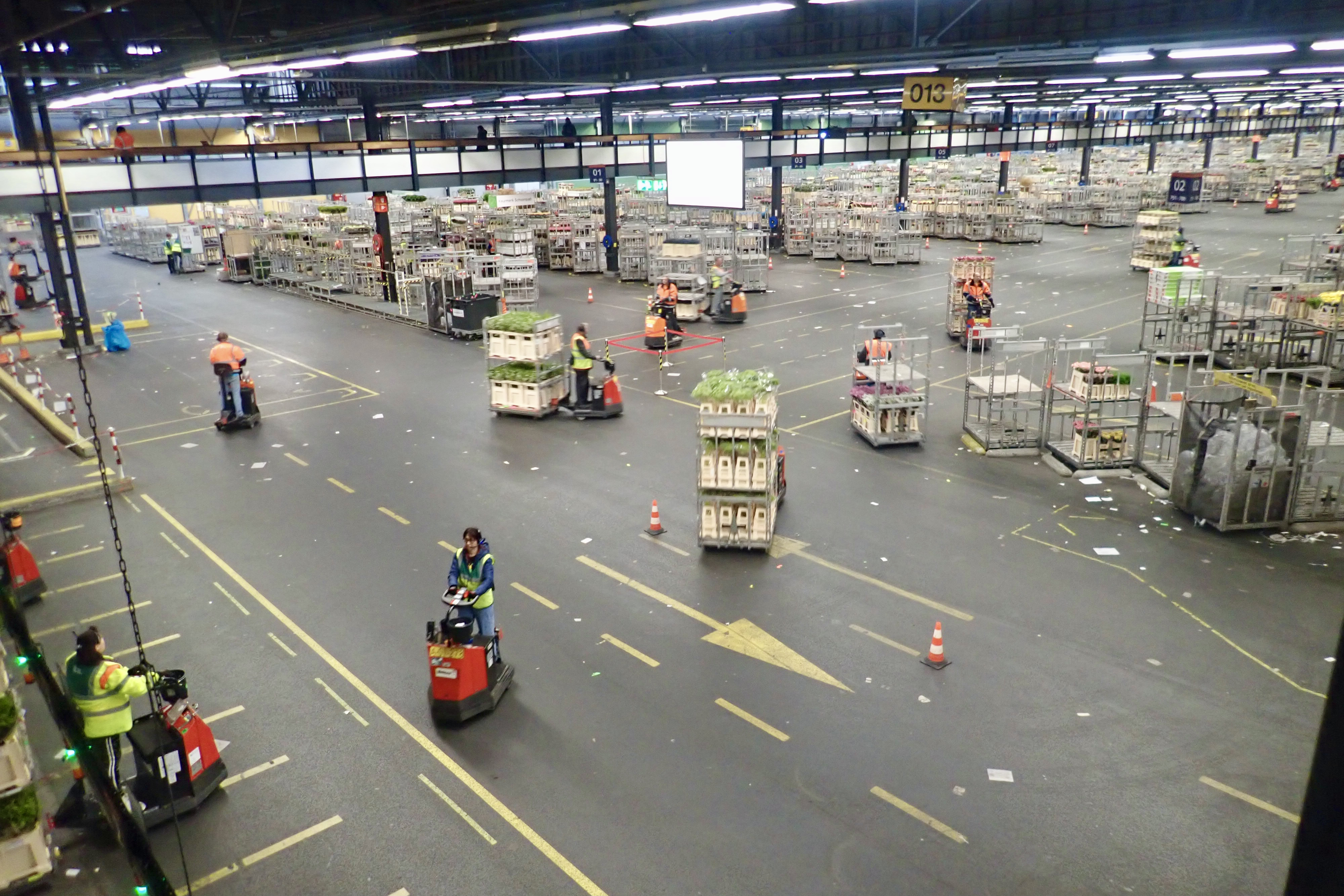 On the other side, workers on carts deliver plants to specific buyers. Many many carts scurrying around in a well-organized dance.