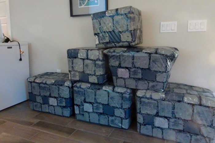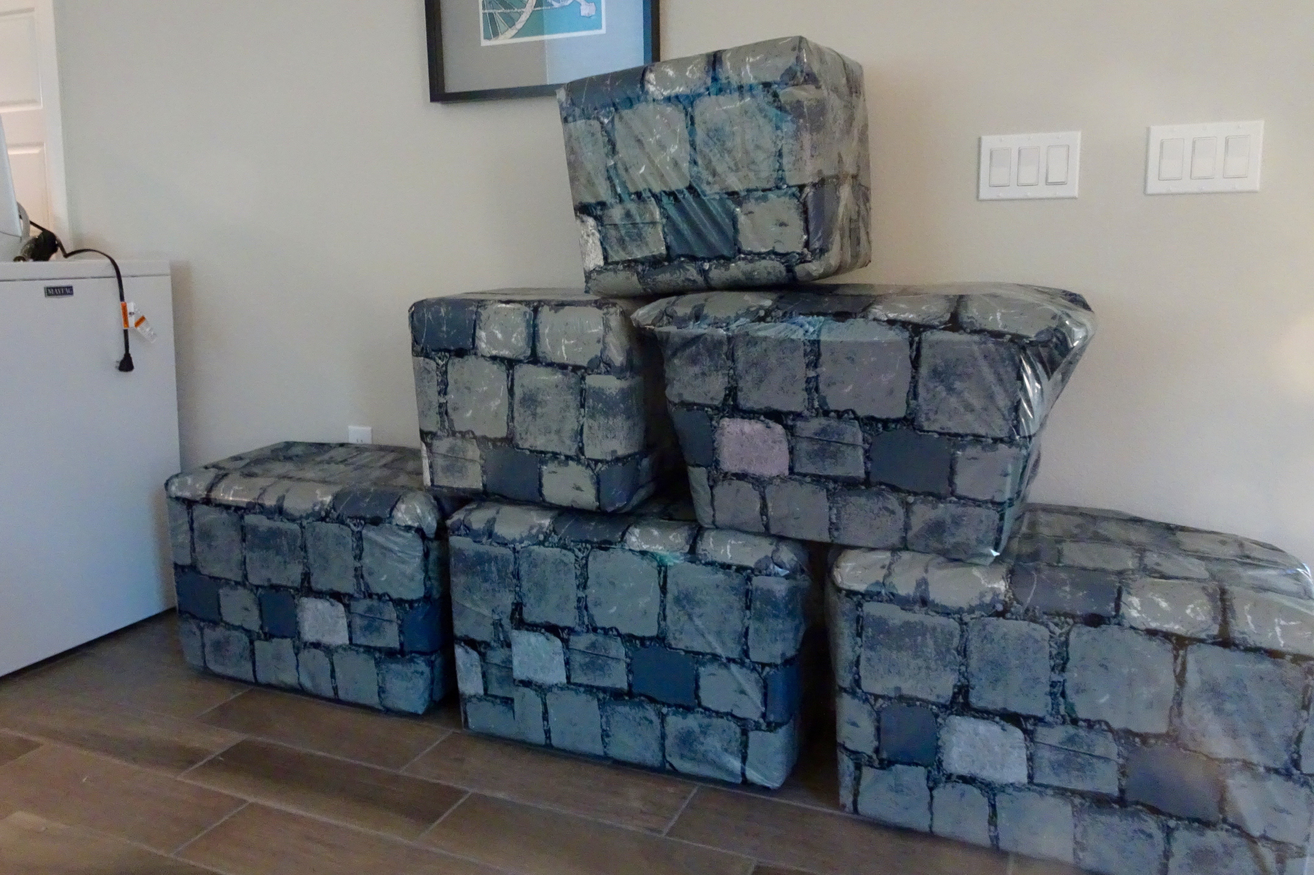 Coolers and styrofoam boxes covered with “stone” plastic table covers will be fortress walls. The washing machine NOT in the laundry room is the subject of the next blog post 😦