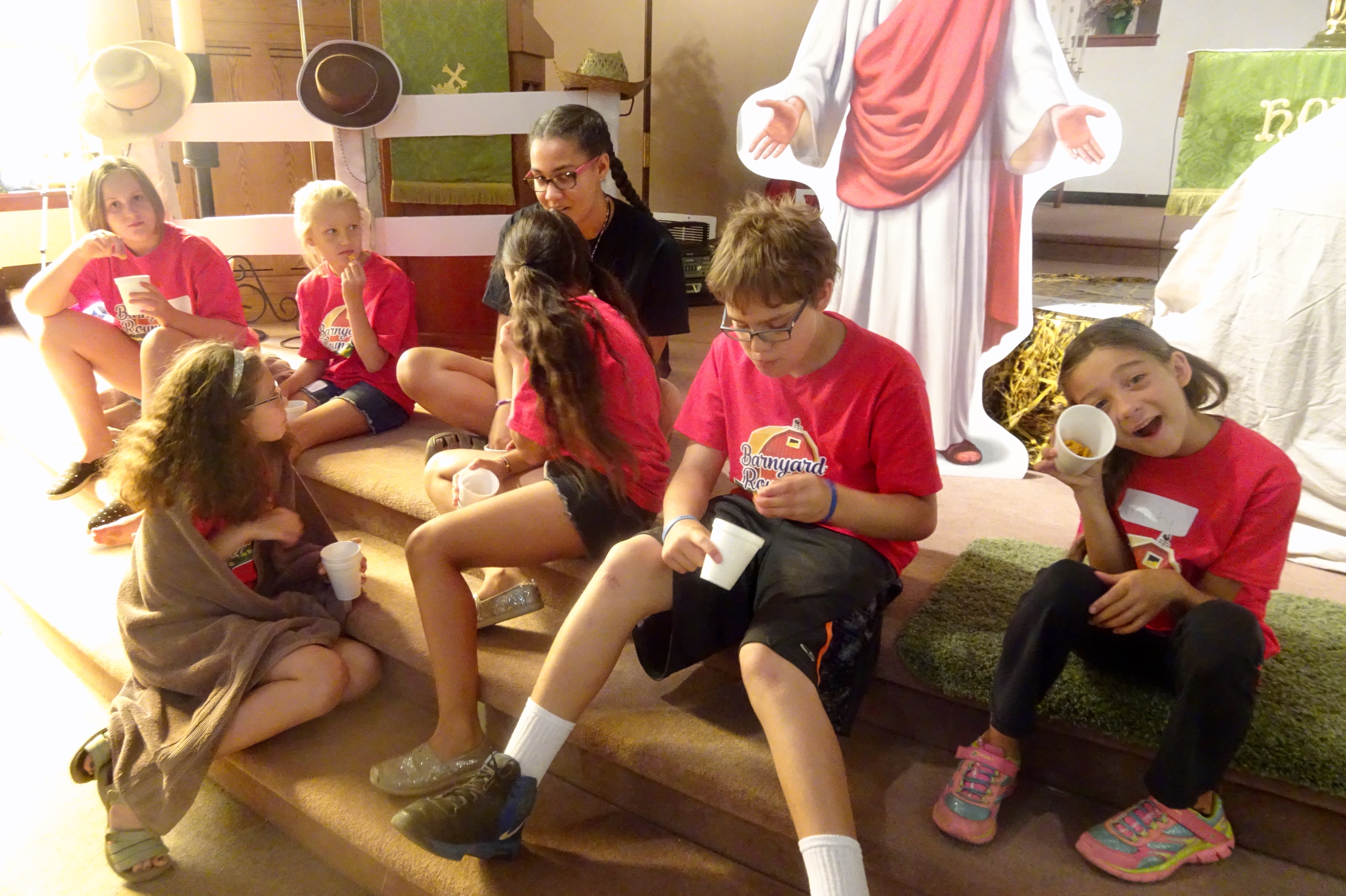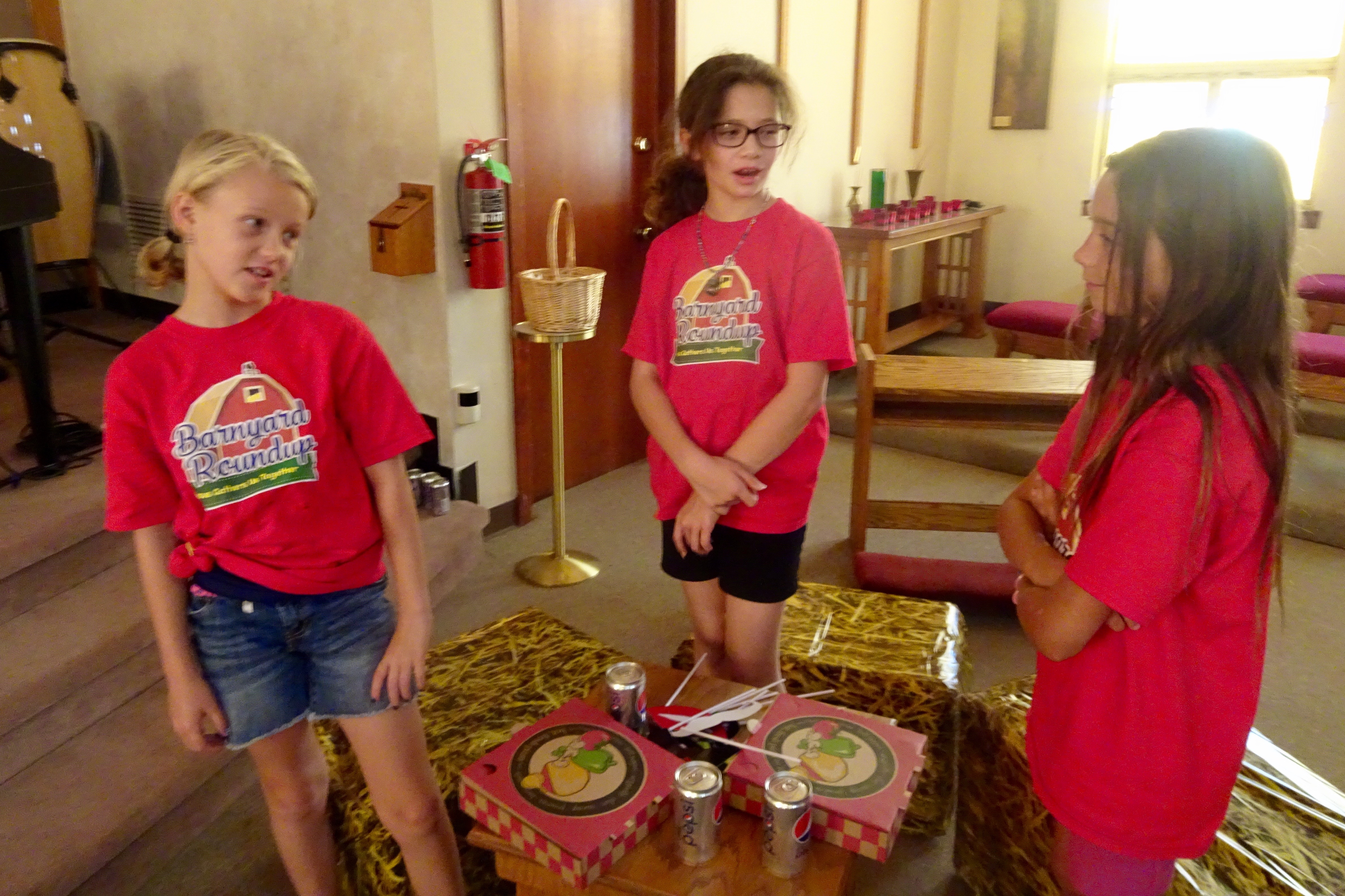 The miracle produced small cups of goldfish crackers and wheat thins (bread) for snacking. Then everyone took different parts, we did the 15-minute skit again, and we had a little snack. Repeat.