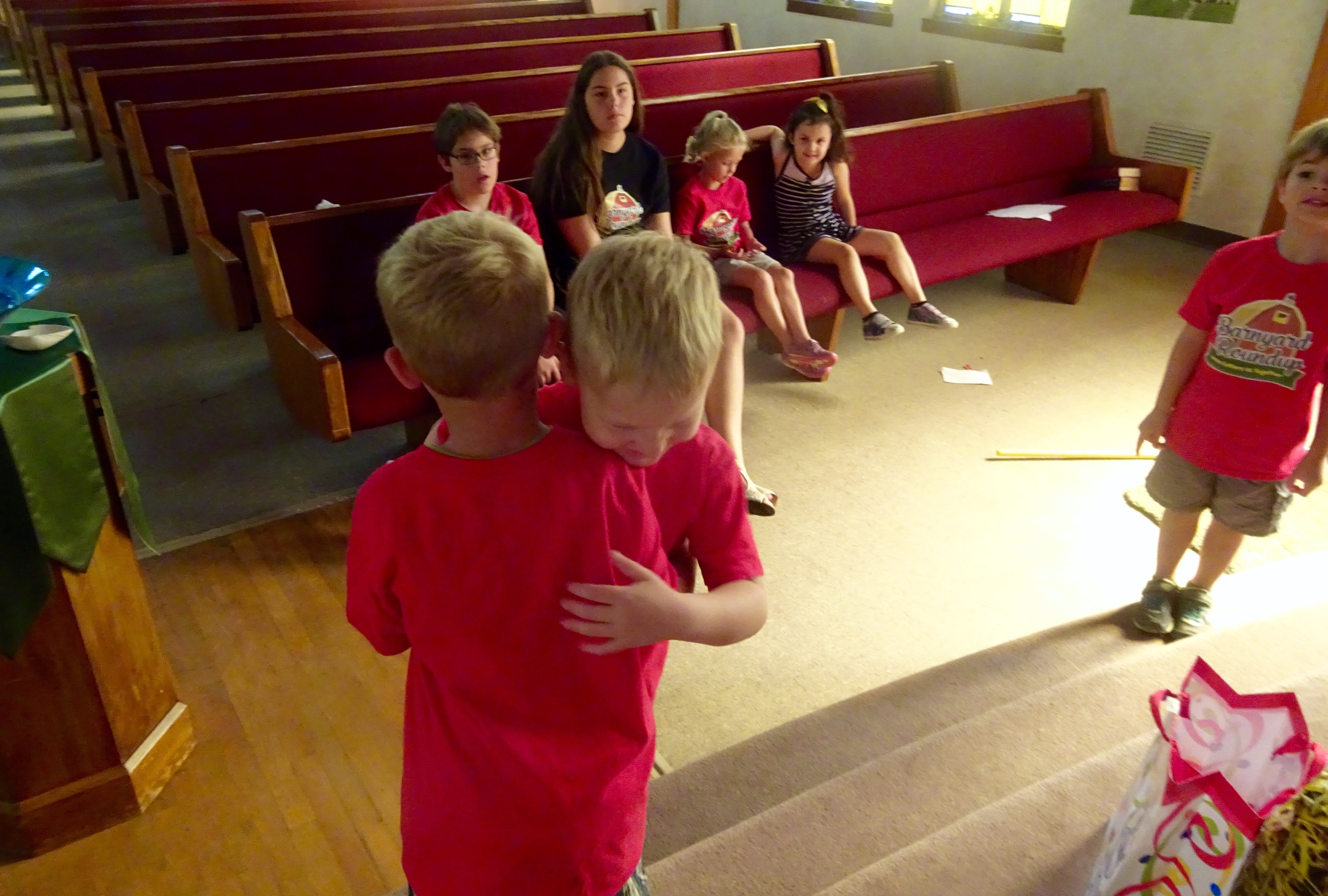 Today’s story was Jesus Tells about a Lost Son. Note: two boys wanted to be the wayward son, so we had two sons. Here the father is giving his sons money to go out into the world: