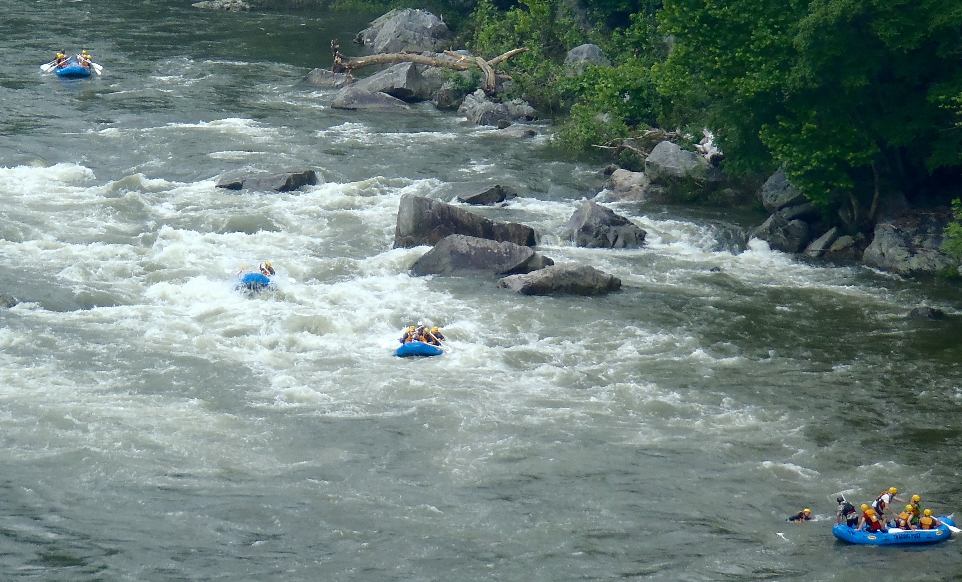 From the bridge into Ohiopyle, I spotted a slew of rafters getting ready to run the rapids. Last year, we saw lots of people tumble into the water then scramble to get back aboard. This year, there seems to be a team of people ready to assist.