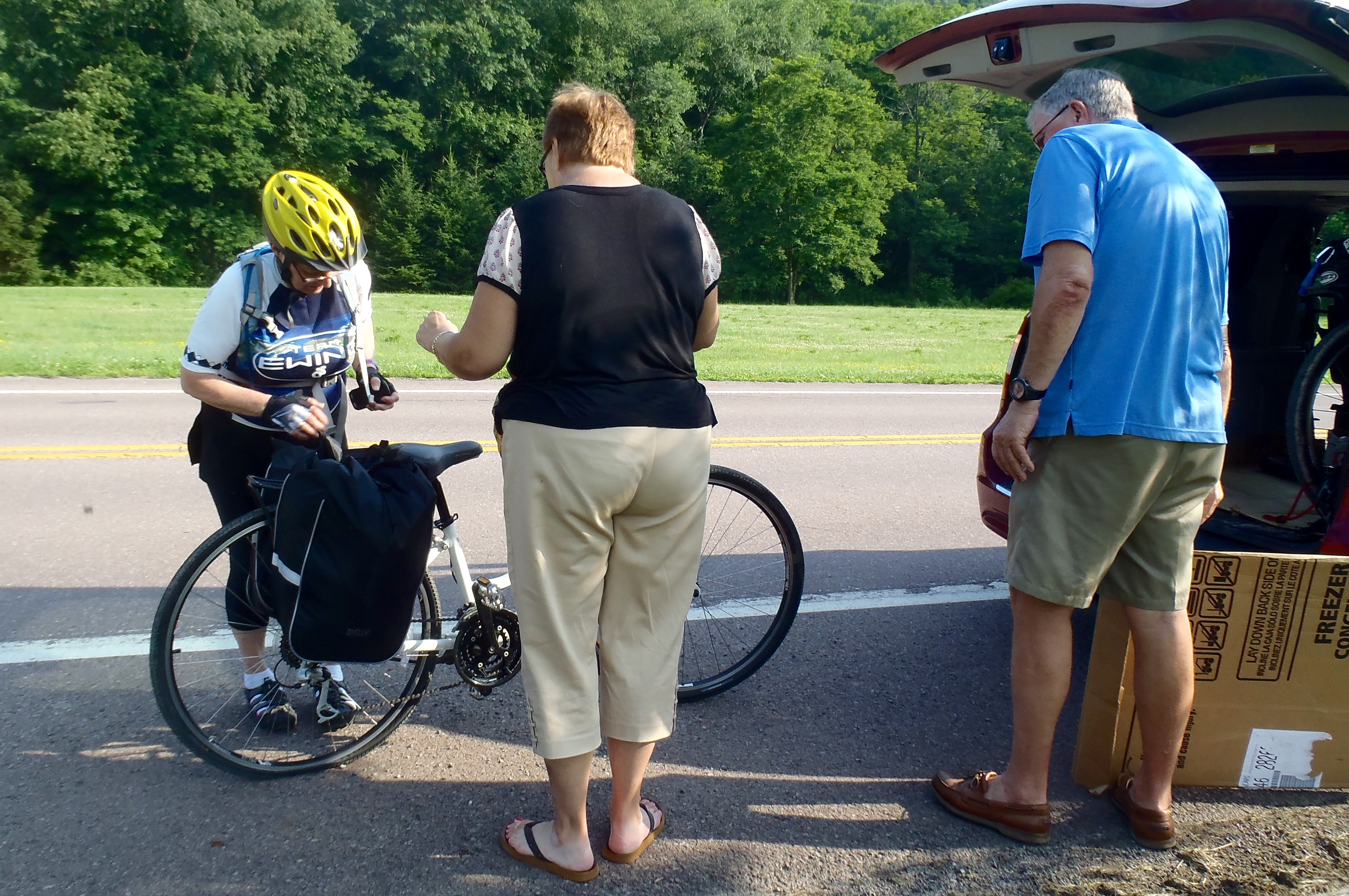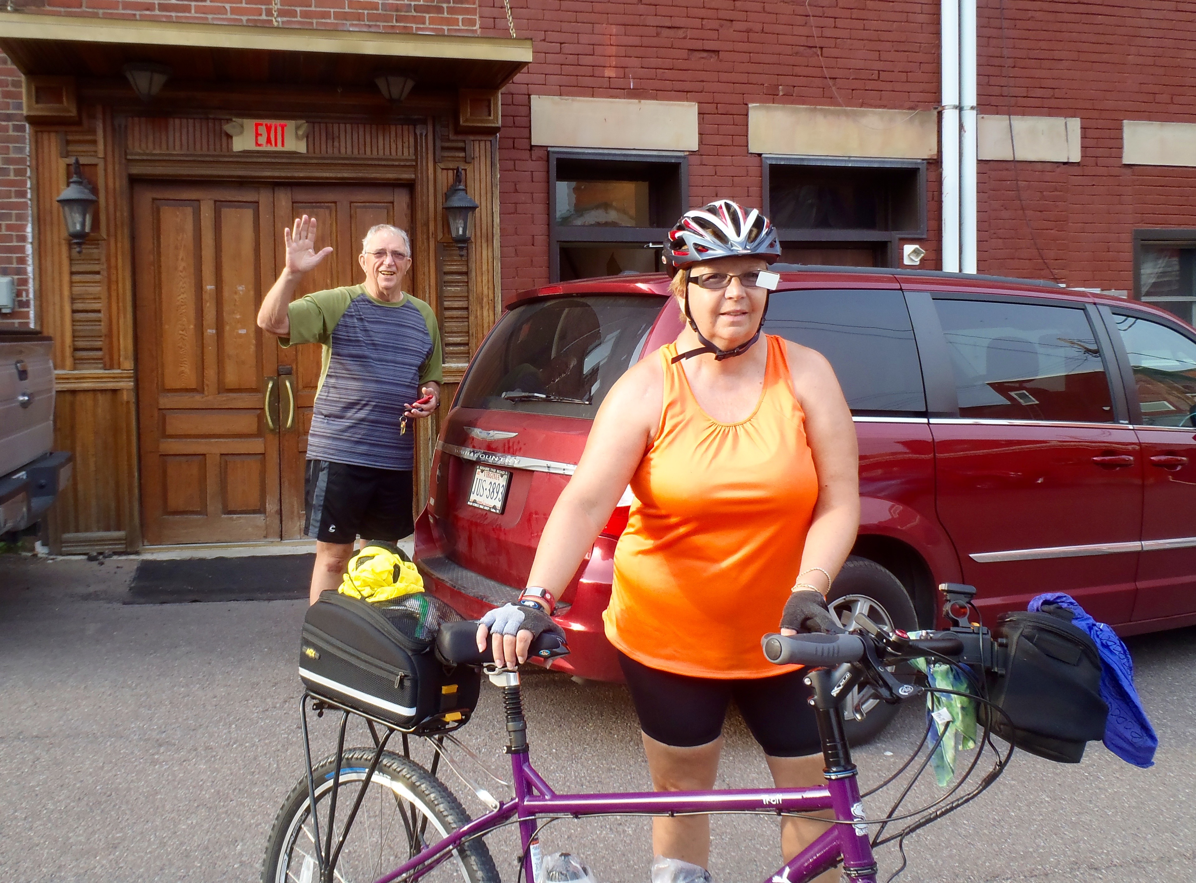 On the way to dinner, Billie pulled over to the side of the road because she recognized a bicyclist we’d met in Connellsville. At about 7 pm, Sharon was walking her bike and still 20 miles from her Rockwood destination.
