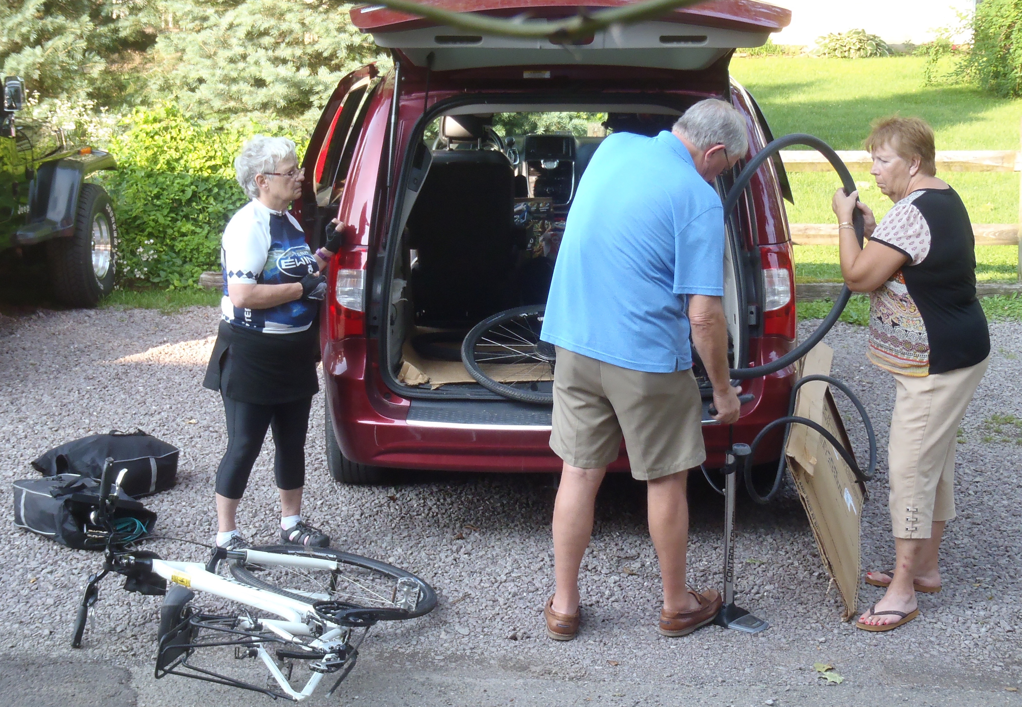 They loaded Sharon and her bike in the van and drove to Rivers Edge Restaurant. (I walked the half mile so there was enough room.) Sharon had had about 3 flats that day and was WAY behind schedule. Billie and JD worked to fix the flat, then we all had dinner together.