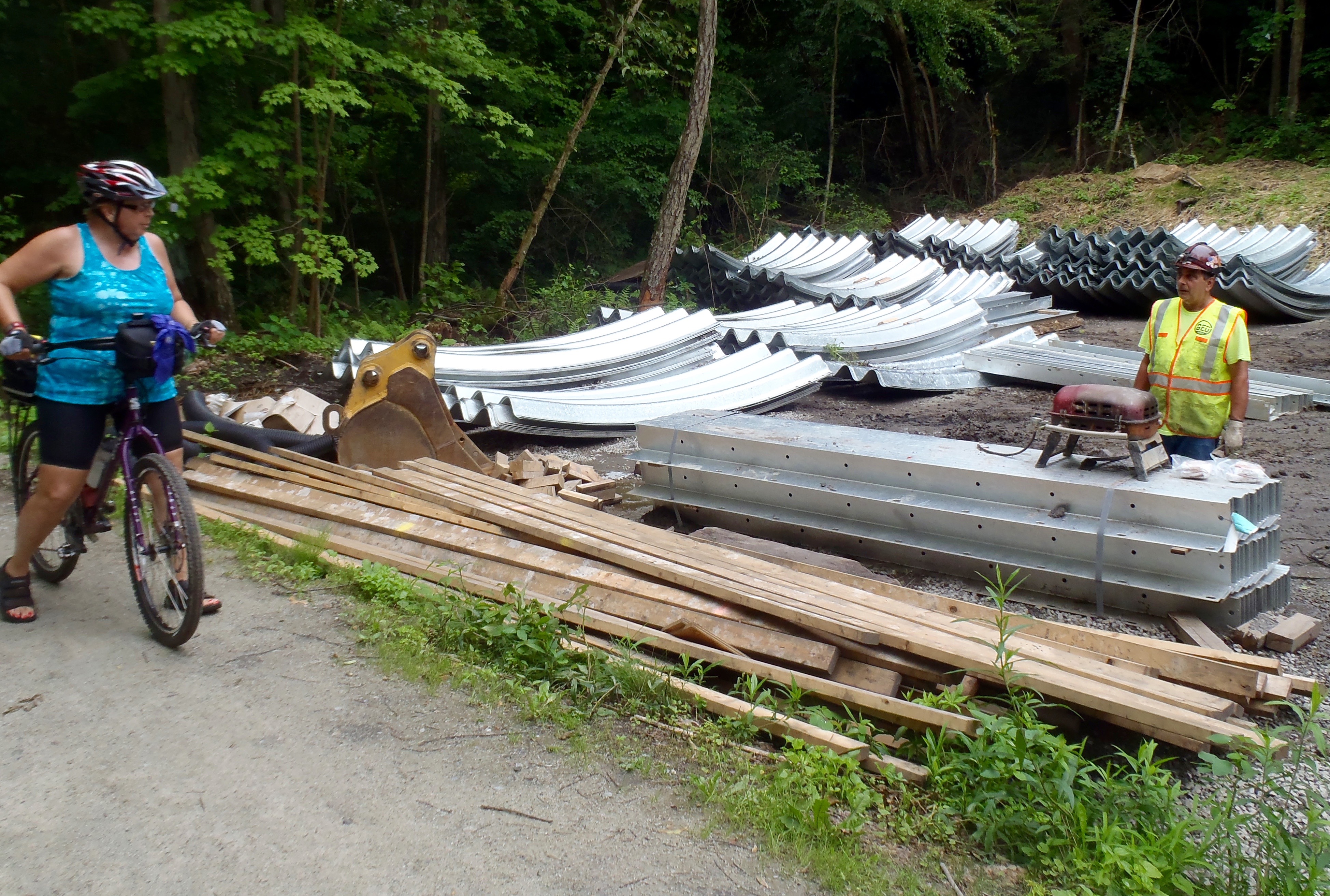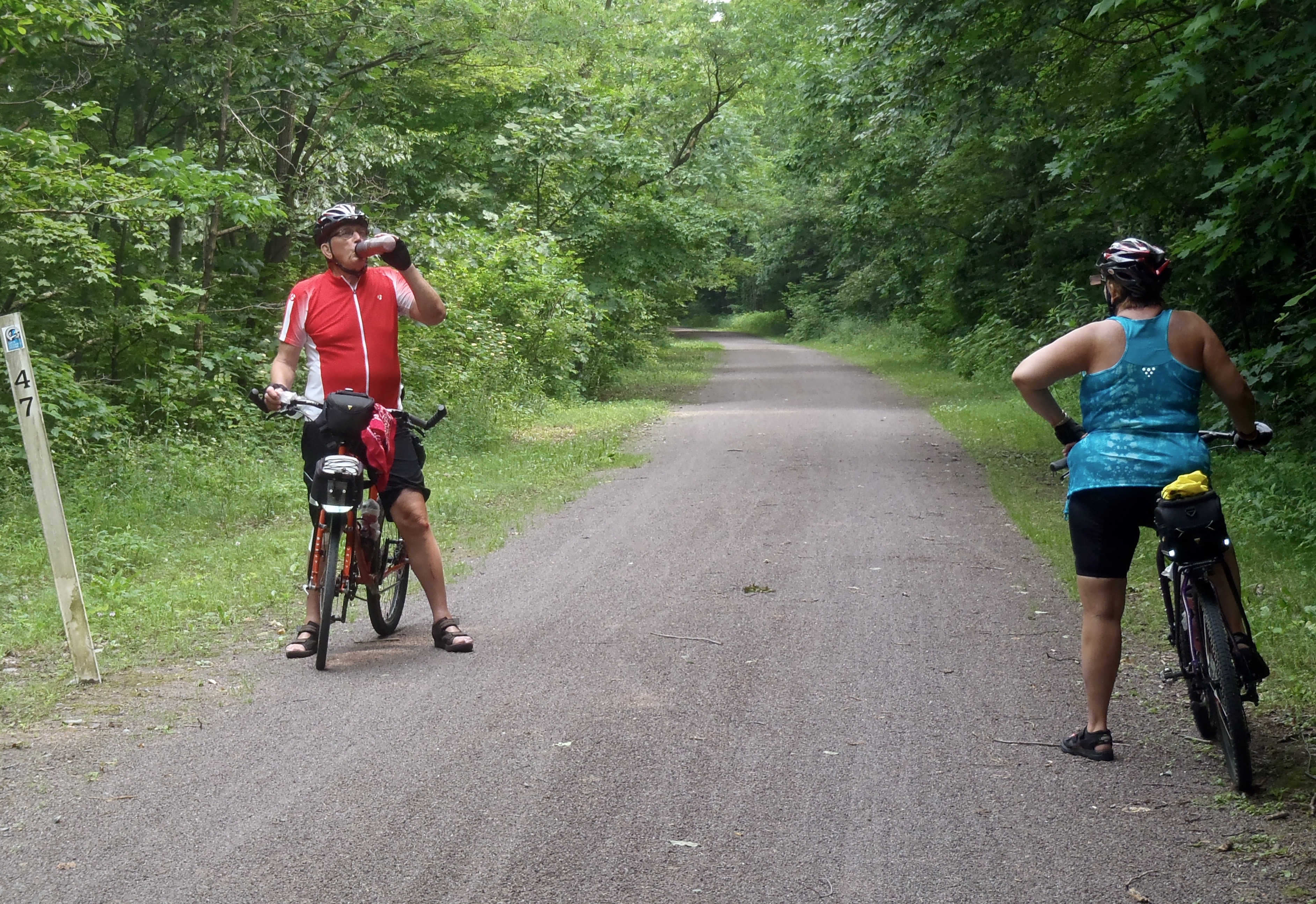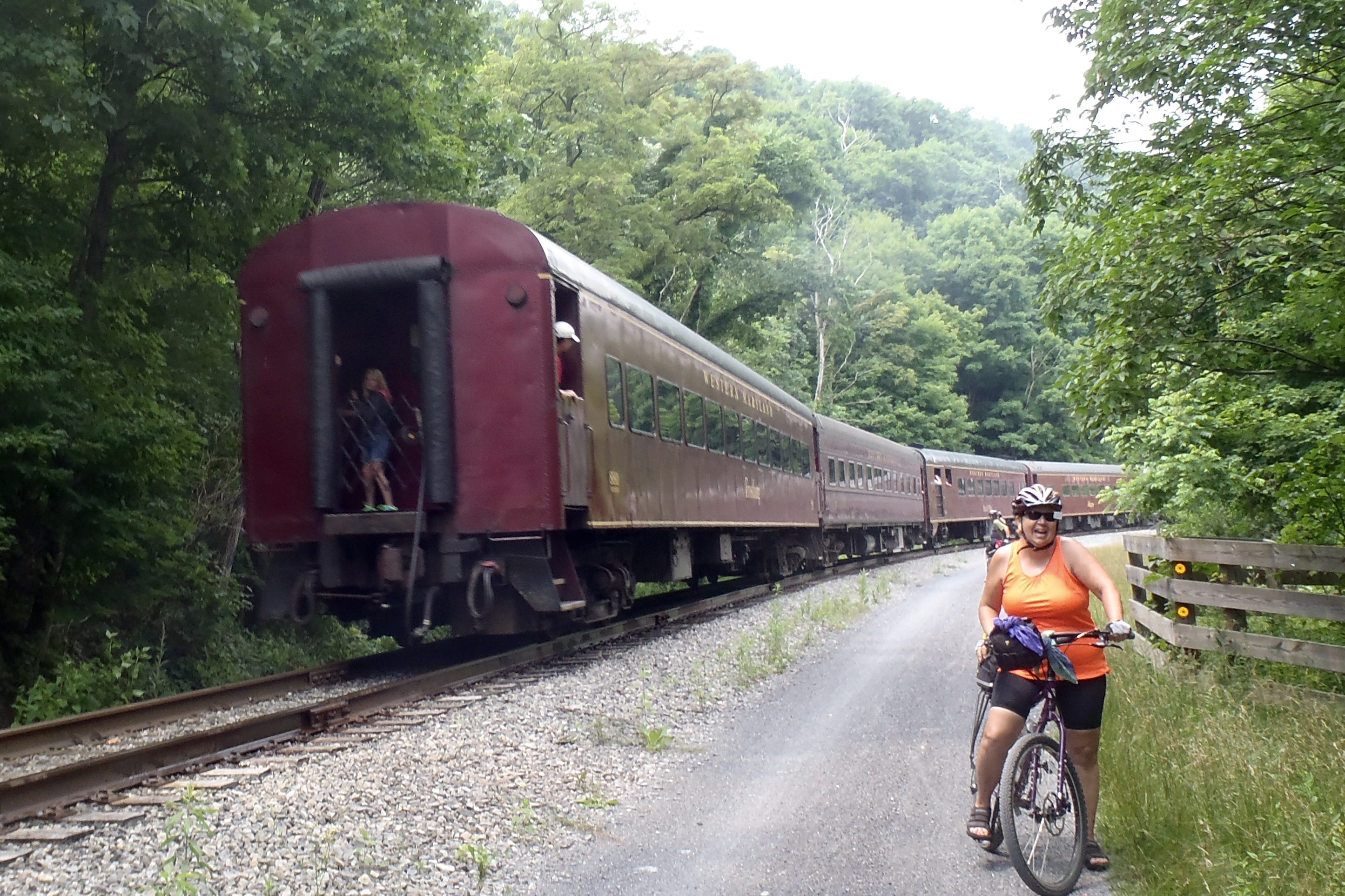 Sharon, a retired school teacher and librarian from Oregon was riding Pittsburgh-Washington DC by herself on a rented bike. We were thrilled to become her Trail Angels – so many people have helped us in the past with our various bicycle touring difficulties, it felt good to pay it forward. After dinner, Billie and I drove her the final 20 miles to her B&B in Rockwood. (NOTE: in the following days, we learned there was a small piece of metal in the tire which caused continual flats, the bike rental company arranged to have the tire replaced and for the next transportation rescue so she could keep on schedule. Sharon arrived in Washington DC on July 6 and plans to do the same ride next year – with greater success and fewer flats.)