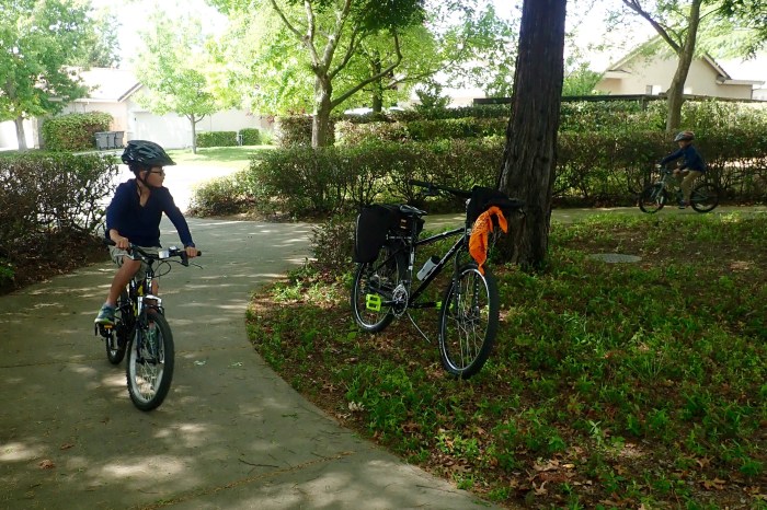 Now that all basic street-riding skills have been taught, it was time to practice those skills on the street. Which we did. Then we rode a cool trail with a (sort-of) round-about. All the boys loved riding around and around, relatively fast, laughing all the way.