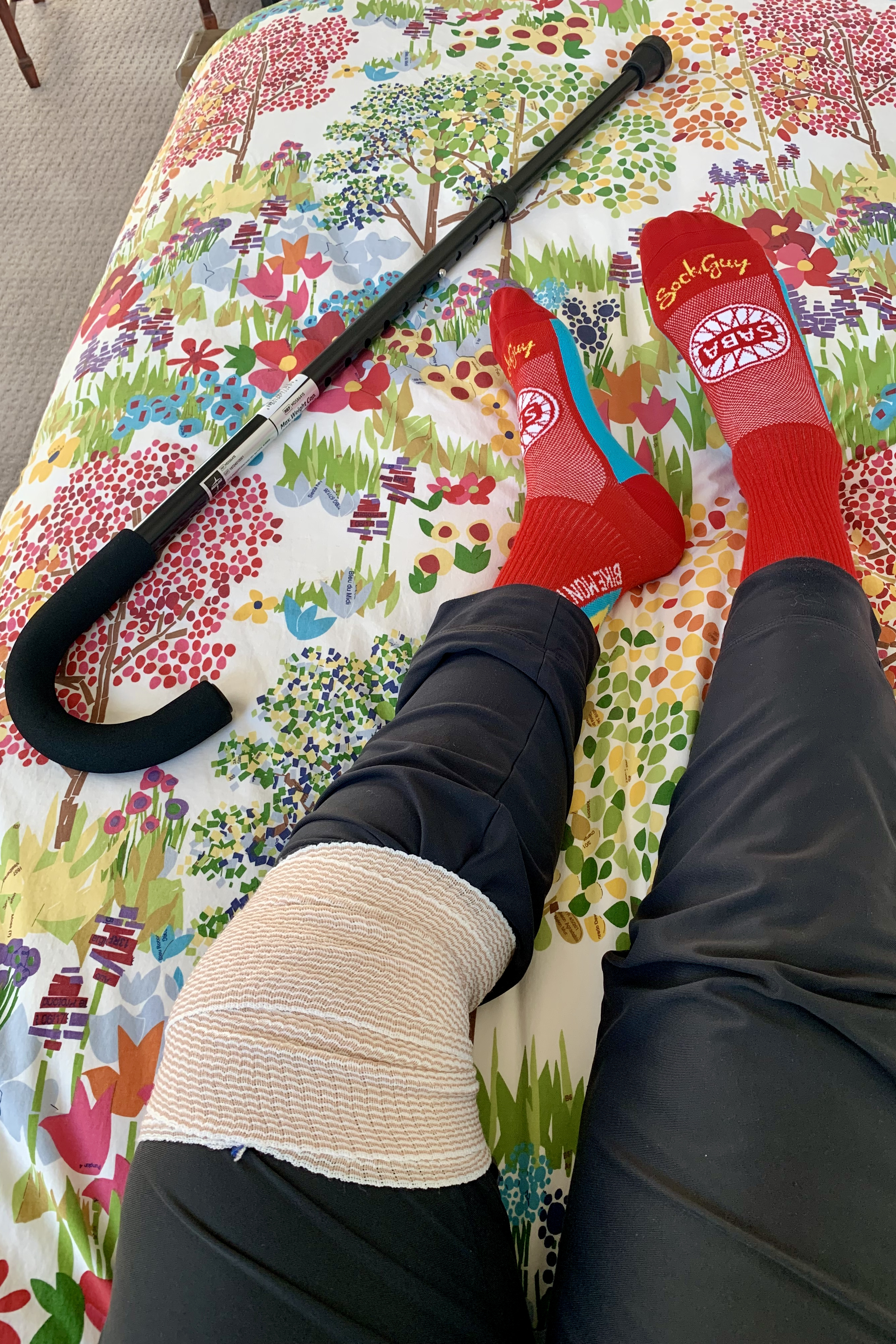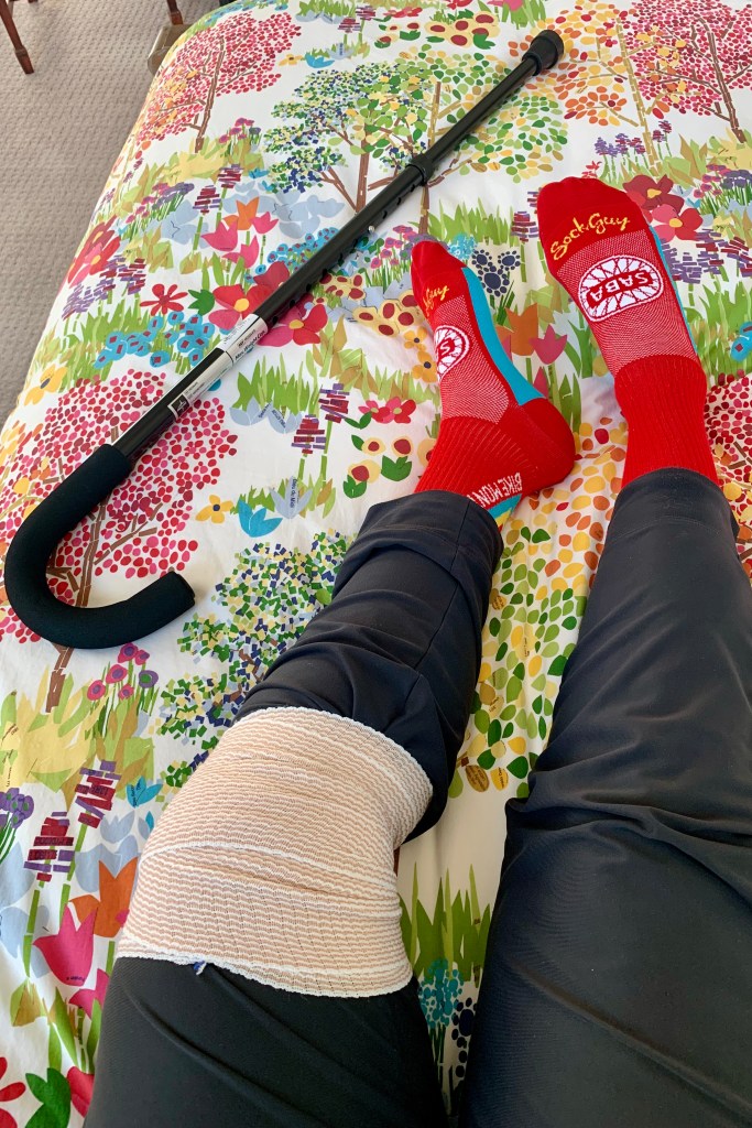 However, on Monday morning, as we were getting all the bikes out of the classroom where they were stored, I tripped on a kickstand and fell. HARD on my left knee. Not good. The PRS team and school personnel moved into action. Cheryl picked up me and my bike and took “us” home. I was able to drive myself to a Kaiser urgent care. Whew! Nothing broken. Two days of rest and I would be just fine (really?). This was me Monday through Wednesday doing RICE: rest, ice, compression, elevate.