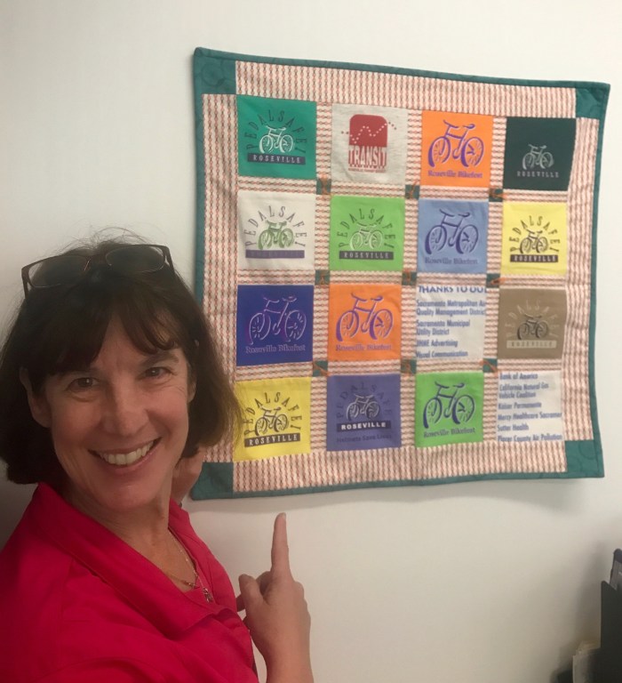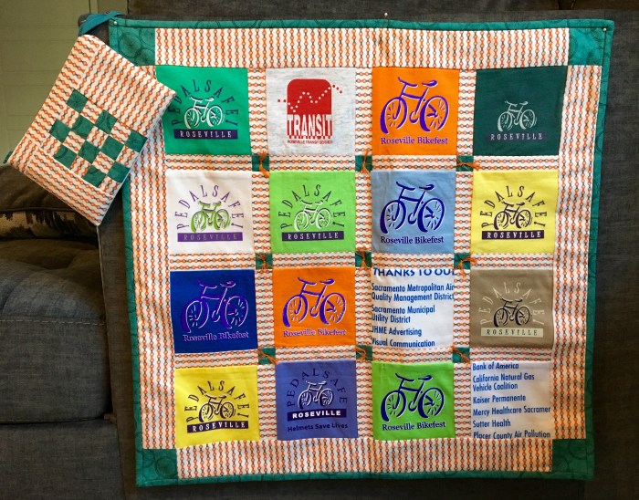 After work each day, I worked on a mini-quilt for a friend, Sue Schooley, who gave me a bunch of commemorative t-shirts from the annual Roseville Bikefest that she organizes. Also, a little zippered bag with the scraps.