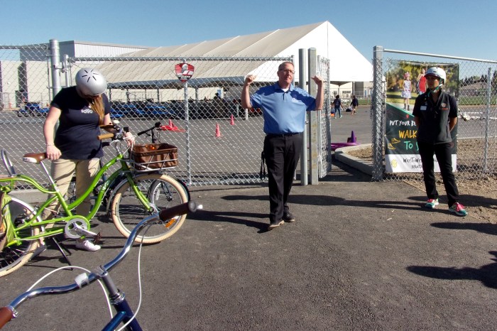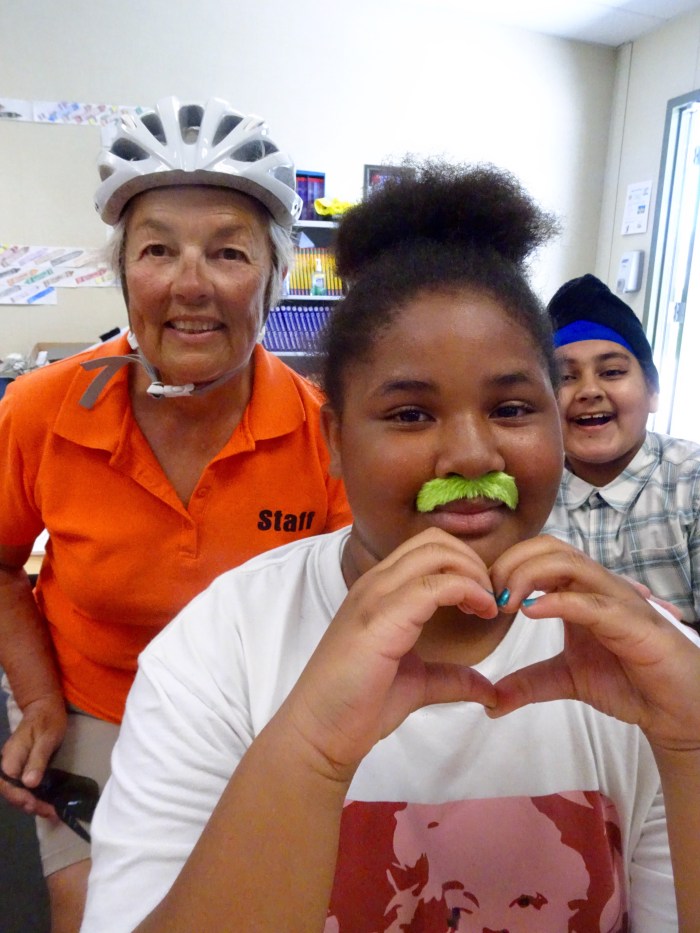 Outside, students prepare to do the ABCQuick Check. A=air in tires. B=brakes. C=chain, chain rings, cassette, cogs. Quick=quick release to adjust seat height.