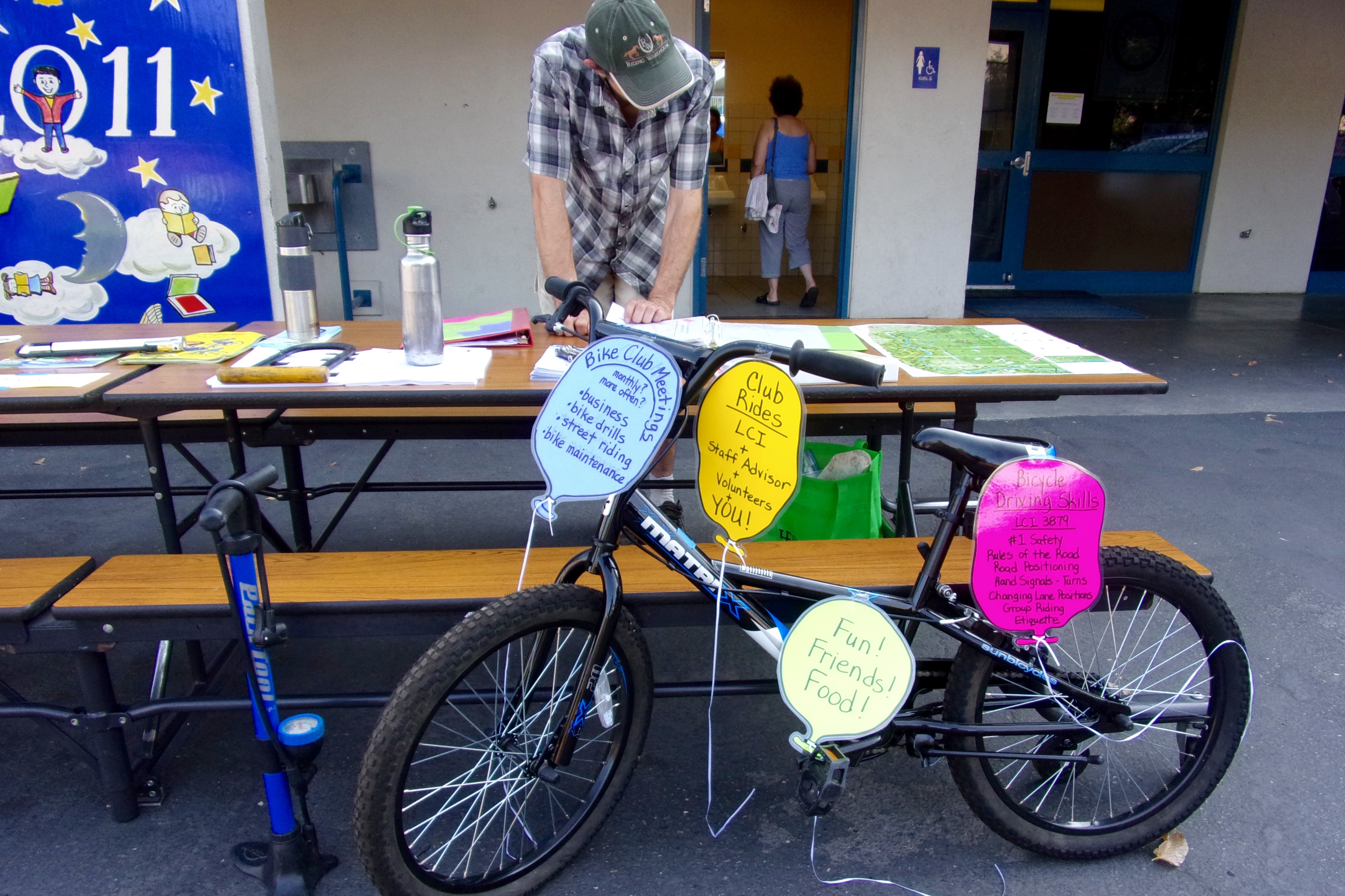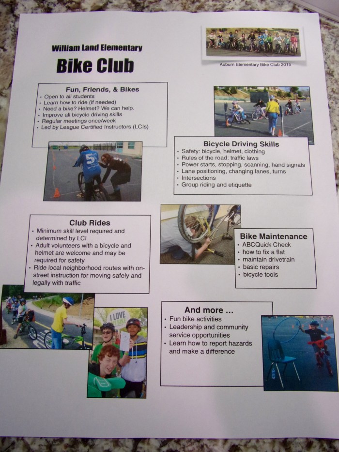 in downtown Sacramento, there are many after-school clubs. This year, one parent thought it would be a good idea to have a bike club. Elle Steele and I responded to the inquiry, met together to create a broad outline, Elle created a letter to parents, I made a flyer with pictures,