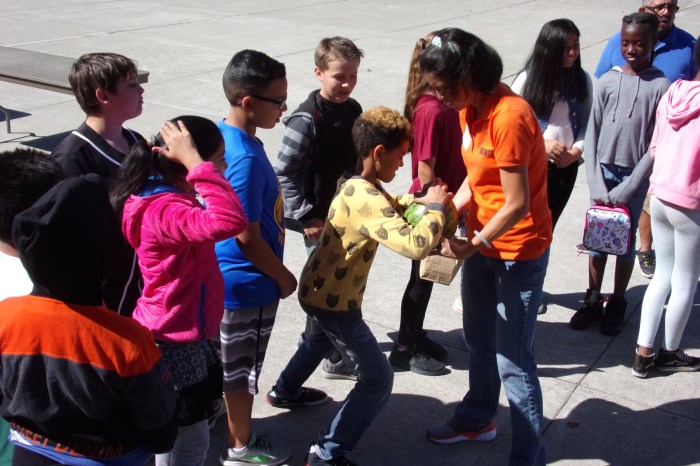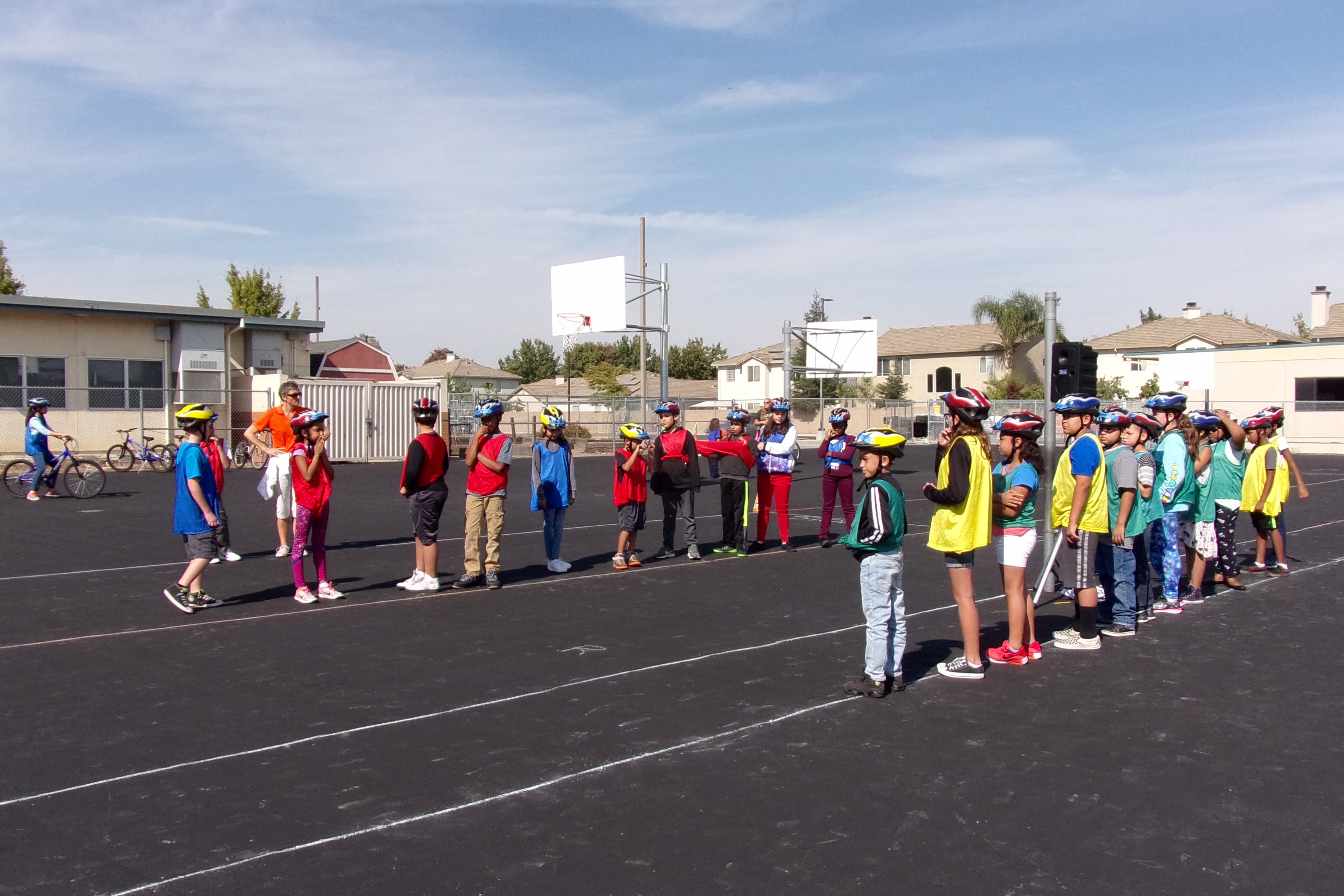 Students wore colored jerseys to identify their group. Before leaving the classroom, they complete a personal safety check.
