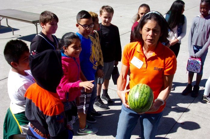 Outside, we teach about brain function and the importance of wearing a helmet. One watermelon wearing a helmet is dropped with not a scratch (usually), the other watermelon doesn’t wear a helmet and cracks open when dropped – with much ooh-ing and ahh-ing.