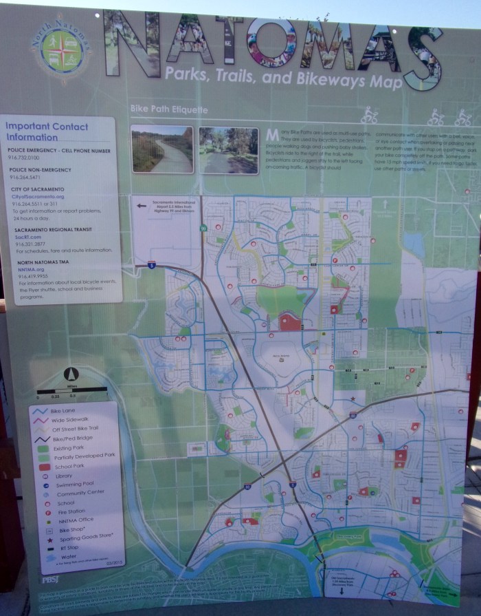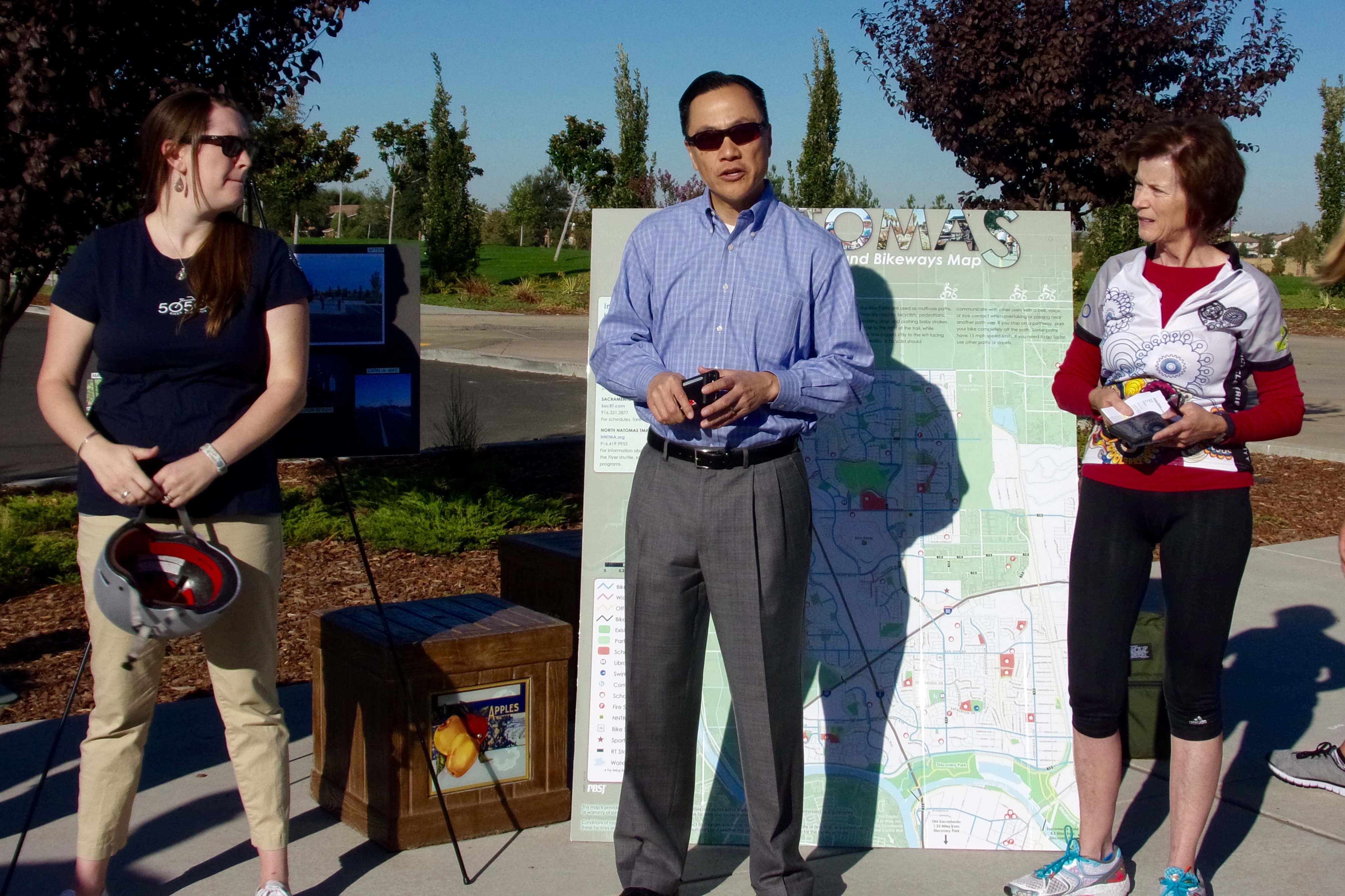 This morning, I met a group of people attending the California Bike Summit conference who chose to go on a short bike tour of the area served by NNTMA (North Natomas Transportation Management Association) to see ongoing projects and various accomplishments. I didn’t attend the conference but was glad to be invited to go on part of this tour, especially since I am now a resident. We were welcomed by Howard Chan, Sacramento City Manager, and an avid bike rider. At left is Abbey Stumpf, NNTMA Marketing Communications Manager. At right is Becky Heieck, NNTMA Executive Director.
