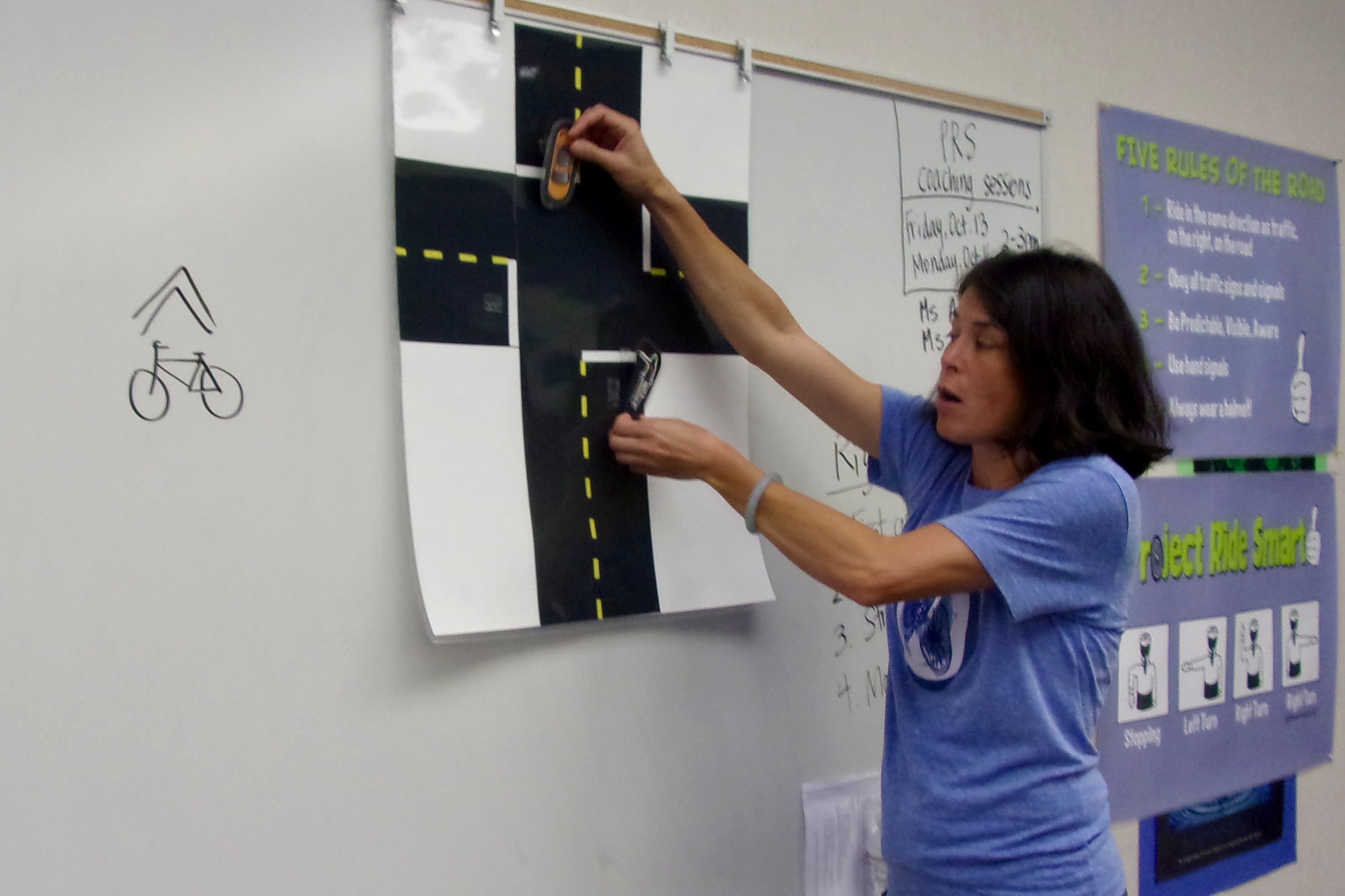As technology progresses, overhead projectors are disappearing. ELMOs (document cameras) are more common, but not at this school. So, to teach the Right of Way Rules, I went back to an “old school” solution – paper chart with movable vehicles. If the #1 rule is “First come, first served,” which car should leave the stop sign first? Second? Third?