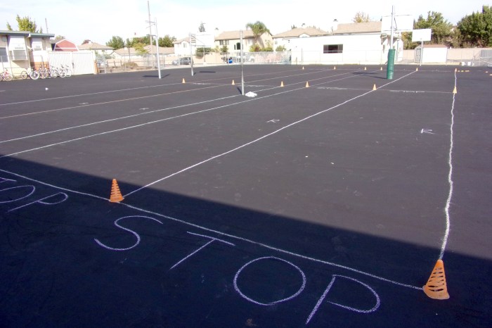 Monday: Uh-oh, over the weekend, the playground was repaved. We had to redraw four 10′ x 100′ lanes – as in bending over and drawing lines with chalk.