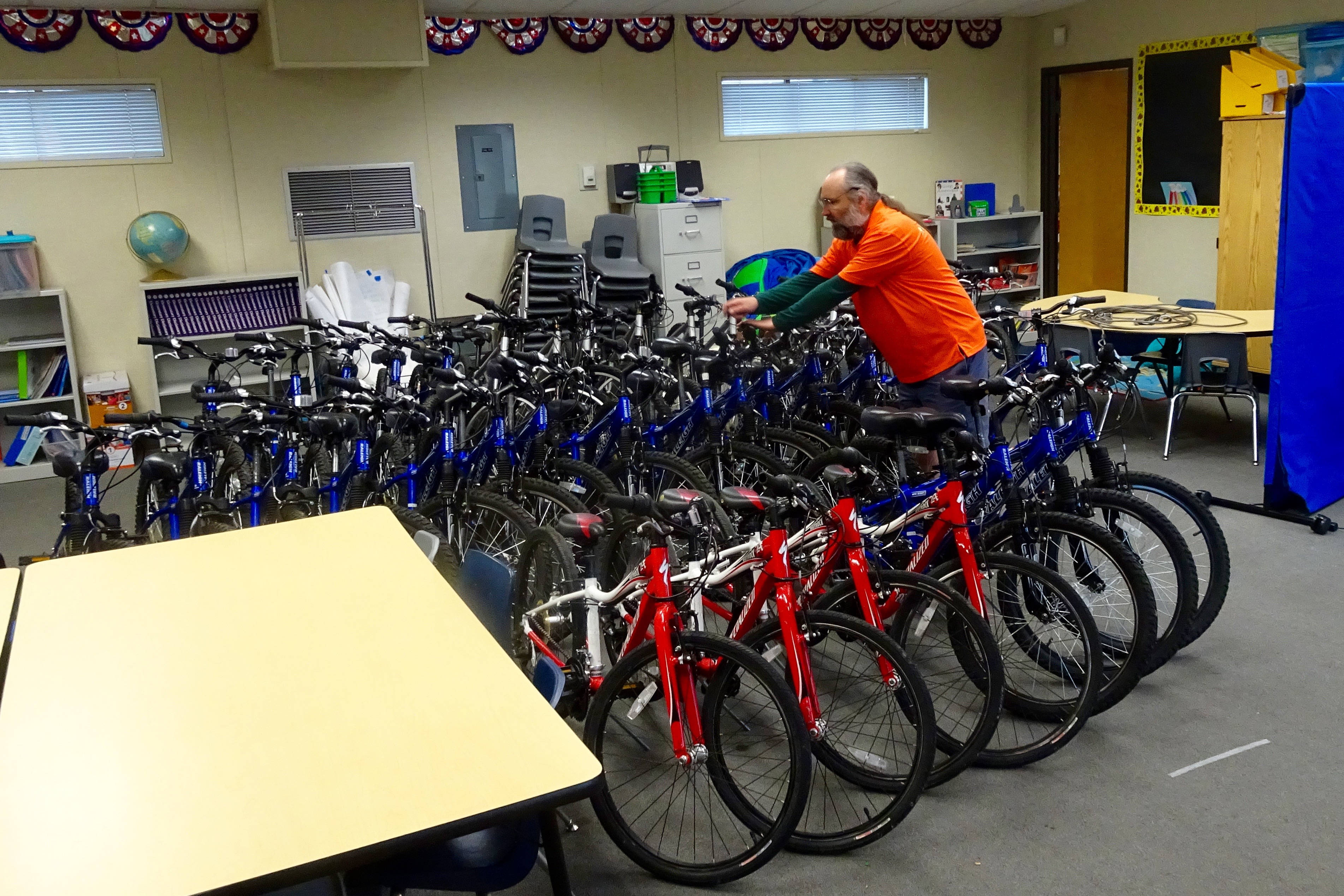 at Regency Park Elementary. I worked 4 days this week. Five classes of fifth graders, one hour/day for each class. My teaching partner is Doug Williams. The 40 bikes are stored in an unused classroom: