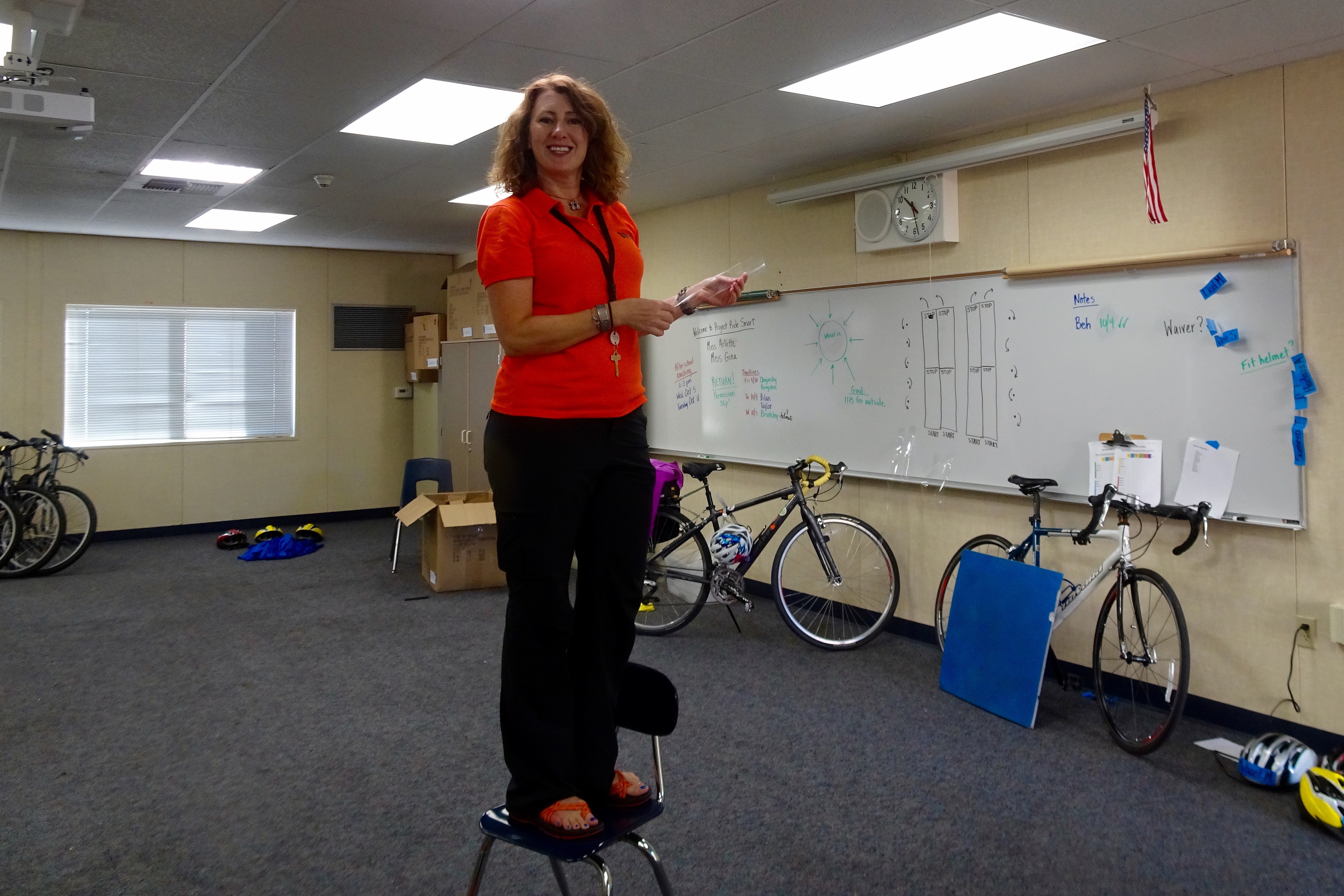 We are lucky to have a dedicated classroom where we can teach and store the bikes and equipment. Gina attempted to make the room darker for better viewing of the videos.
