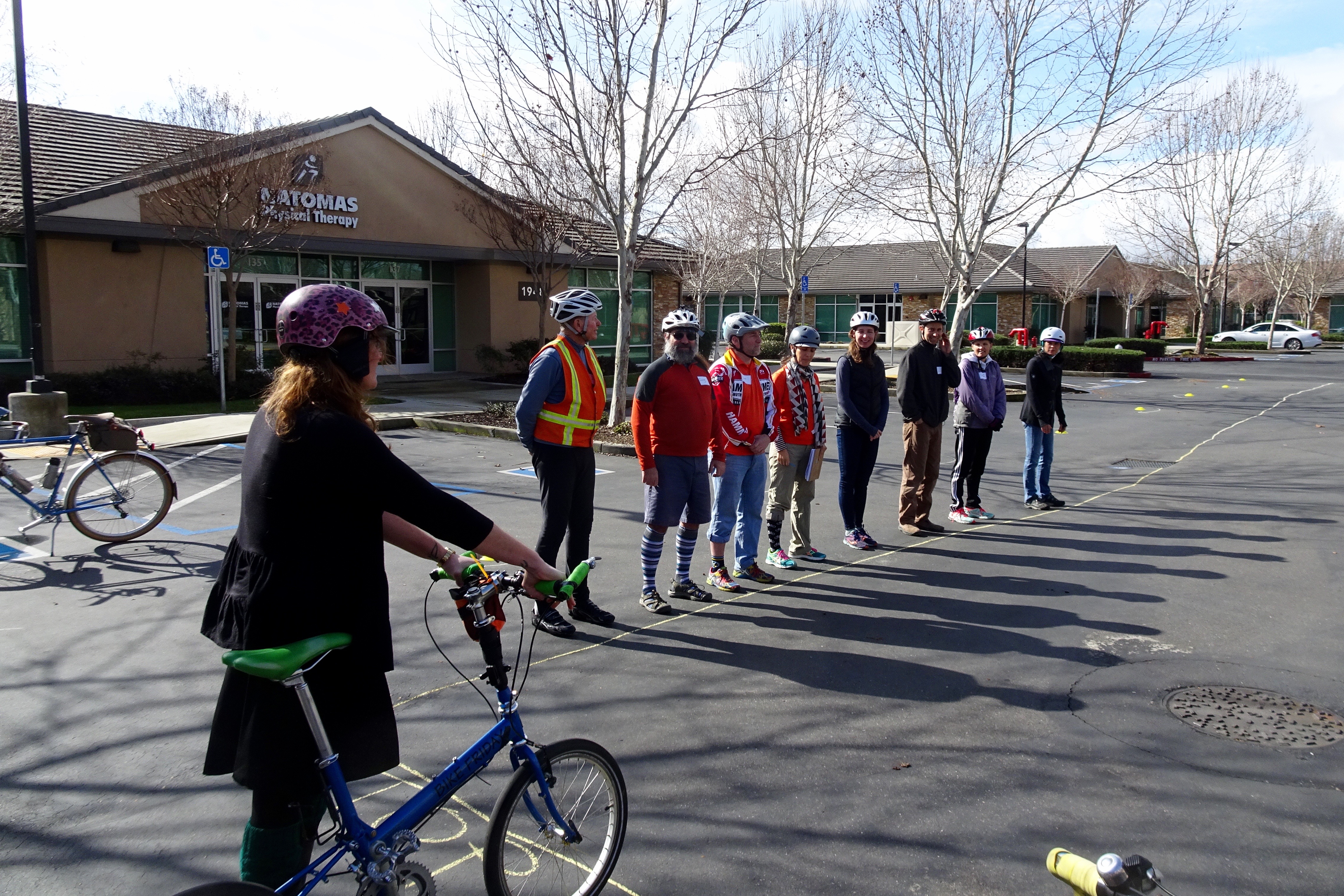 Everyone is lined up to watch me demonstrate a proper left hand turn – the most challenging bicycle-driving maneuver we teach – while Gina described what was happening