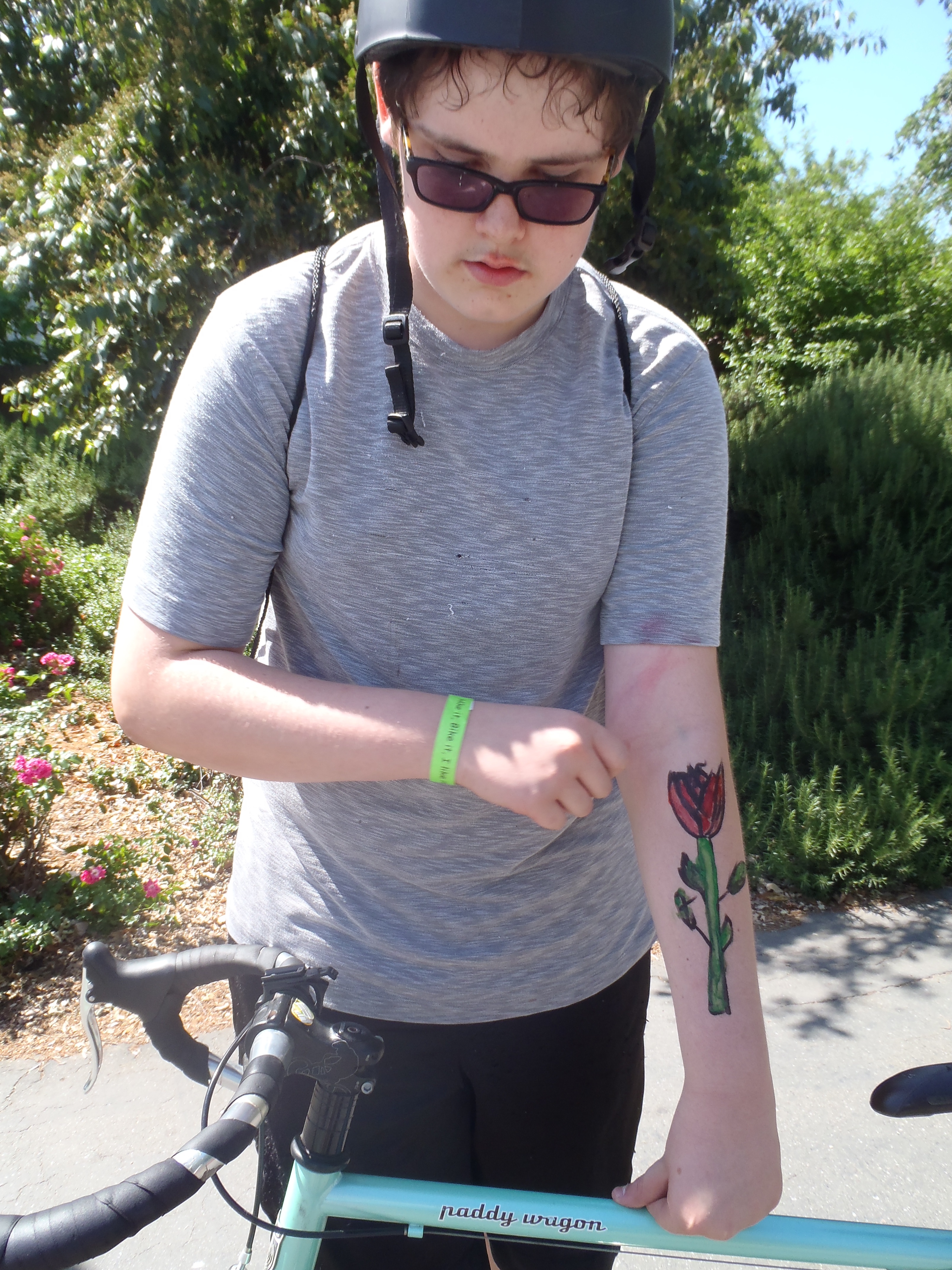 Here we are, ready to ride to Natomas Marketplace, have a hamburger at In N Out Burger, and stop at Tanzanite Skate Park. Except NO one showed up except for staff advisor Megan McManus and me. So Megan and I visited for a half-hour or so and then went on with the rest of our day. I call this receiving a “gift of time”.