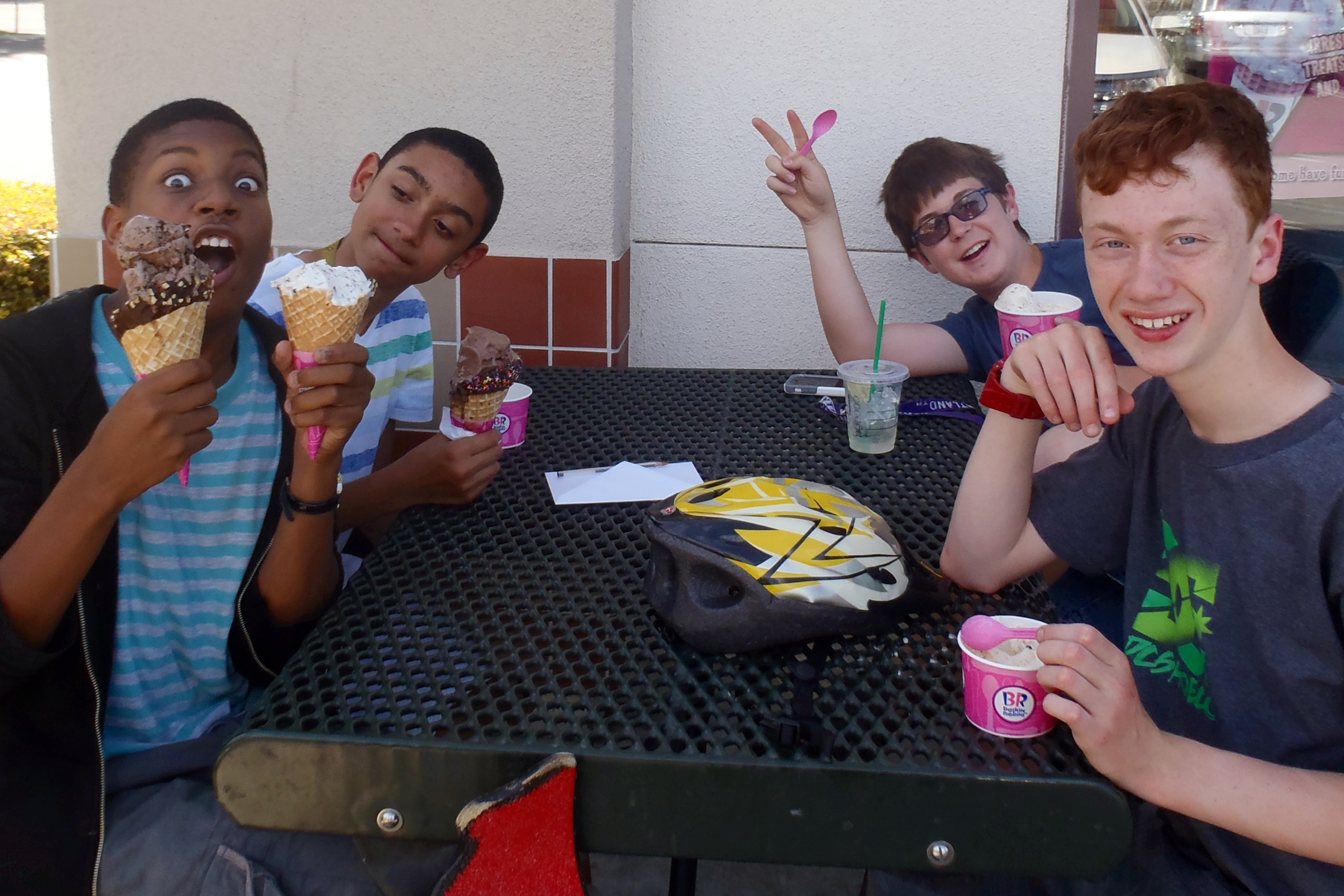 L-R: LaTraye (eating TWO triple-scoops in waffle cones!), Julian, Adam, Jack.