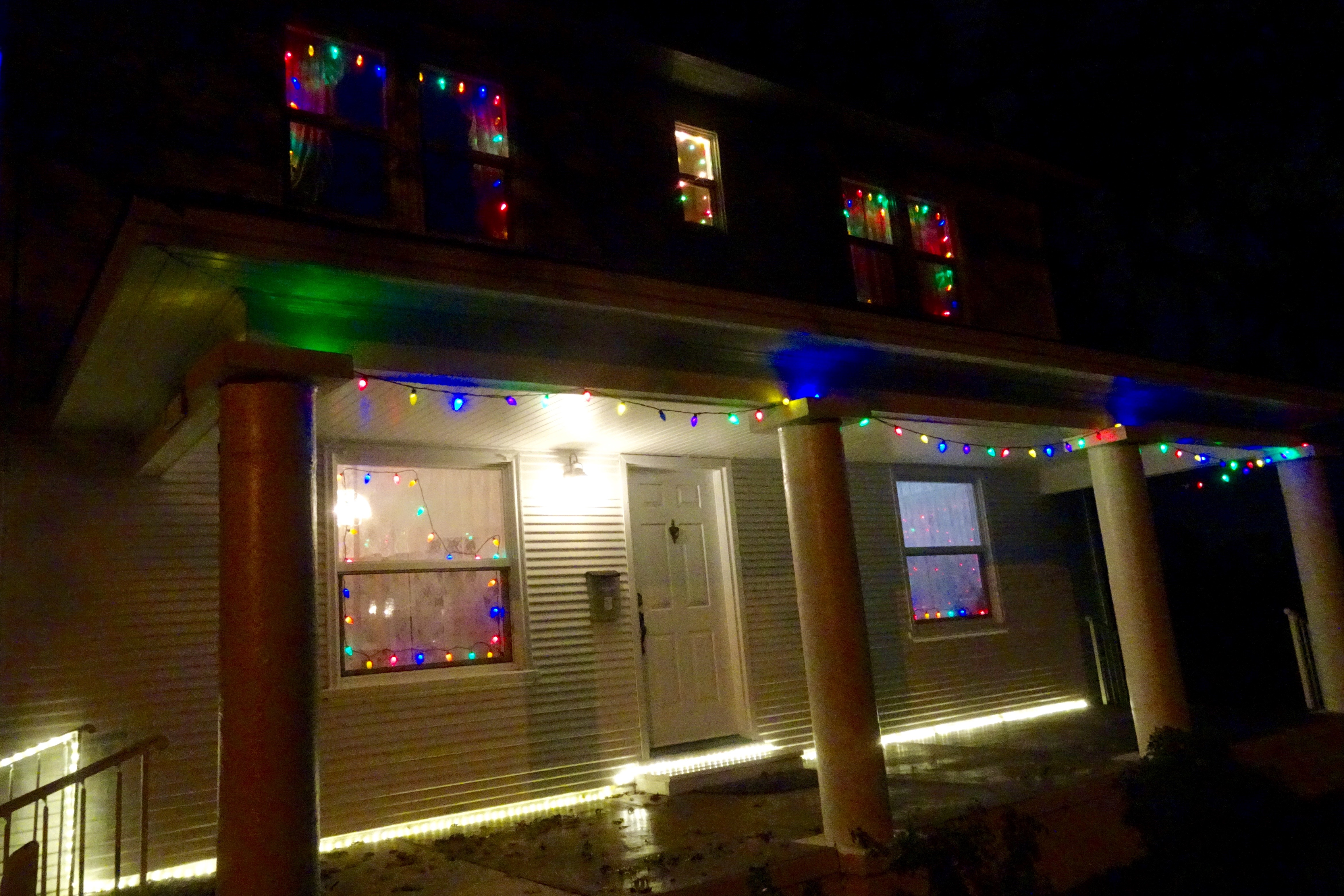 The parade started at Westside School and ended at Depot Park, but the tractor and trailer went back to Dry Creek Ranch House for storage. The ranch house with its Christmas lights: