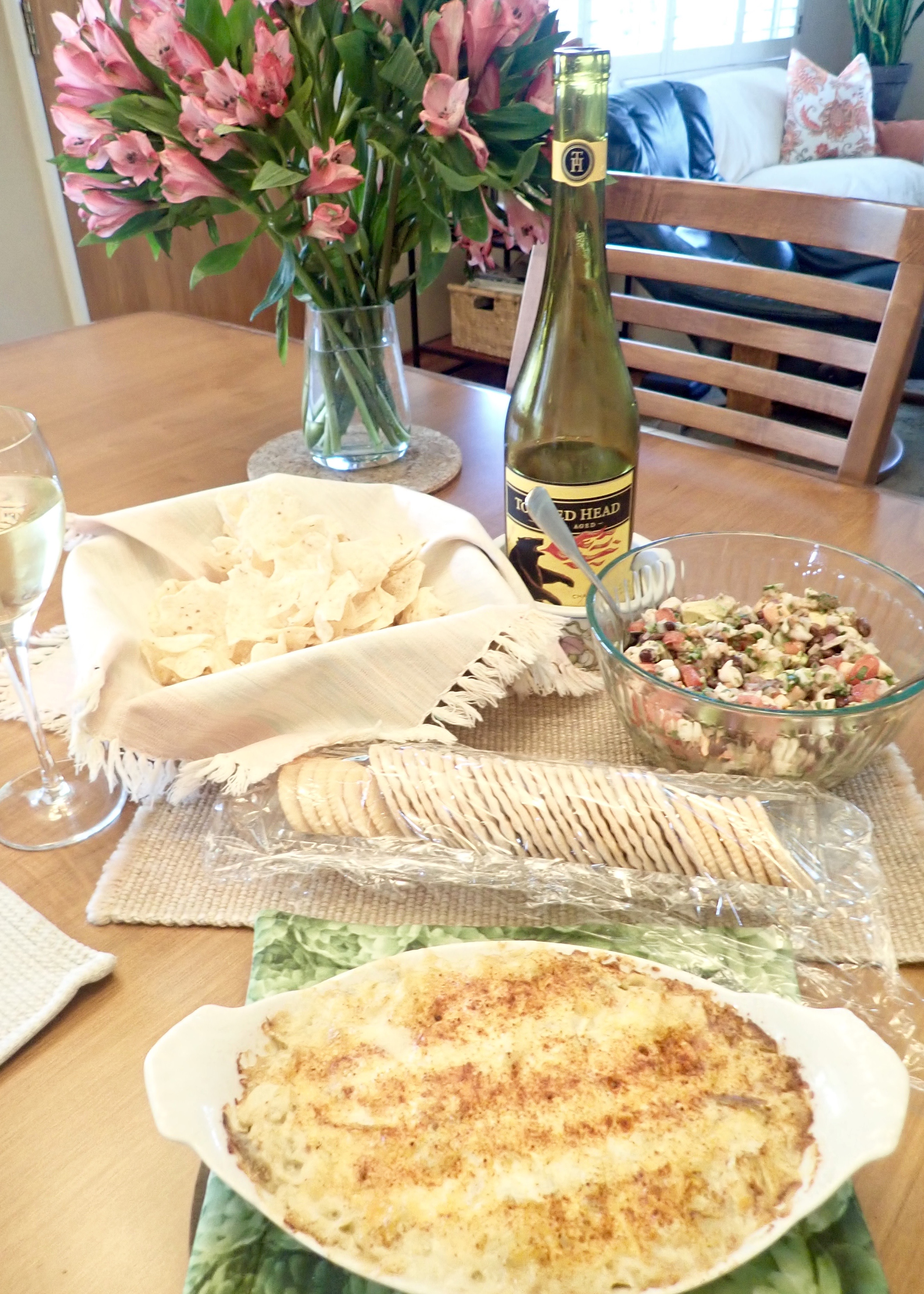 Another delicious get together. Salmon taquitos (that didn’t turn out picture-perfect) with avocado crema and a layered pesto torta. And a very good bottle of wine from Yellowstone Cellars in Billings MT.